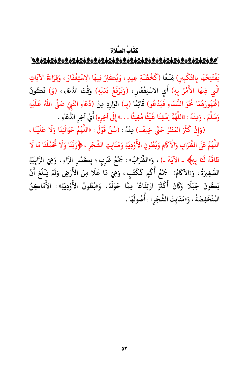 (وَإِنْ كَثُرَ المَطَرُ حَتَّى خِيفَ) مِنْهُ: (سُنَّ قَوْلُ: «اللَّهُمَّ حَوَالَيْنَا وَلَا عَلَيْنَا، اللَّهُمَّ عَلَى الظِّرَابِ وَالْآكَامِ وَبُطُونِ الأَوْدِيَةِ وَمَنَابِتِ الشَّجَرِ، {رَبَّنَا وَلَا تُحَمِّلْنَا مَا لَا طَاقَةَ لَنَا بِهِ} - الآيَةَ -)، وَ «الظِّرَابُ»: جَمْعُ ظَرِبٍ؛ بِكَسْرِ الرَّاءِ، وَهِيَ الرَّابِيَةِ الصَّغِيرَةُ، وَ «الآكَامُ»: جَمْعُ أُكُمٍ كَكُتُبٍ، وَهِيَ مَا عَلَا مِنَ الأَرْضِ وَلَمْ يَبْلُغْ أَنْ يَكُونَ جَبَلًا وَكَانَ أَكْثَرَ ارْتِفَاعًا مِمَّا حَوْلَهُ، وَ «بُطُونُ الأَوْدِيَةِ»: الأَمَاكِنُ المُنْخَفِضَةُ، وَ «مَنَابِتُ الشَّجَرِ»: أُصُولُهَا.