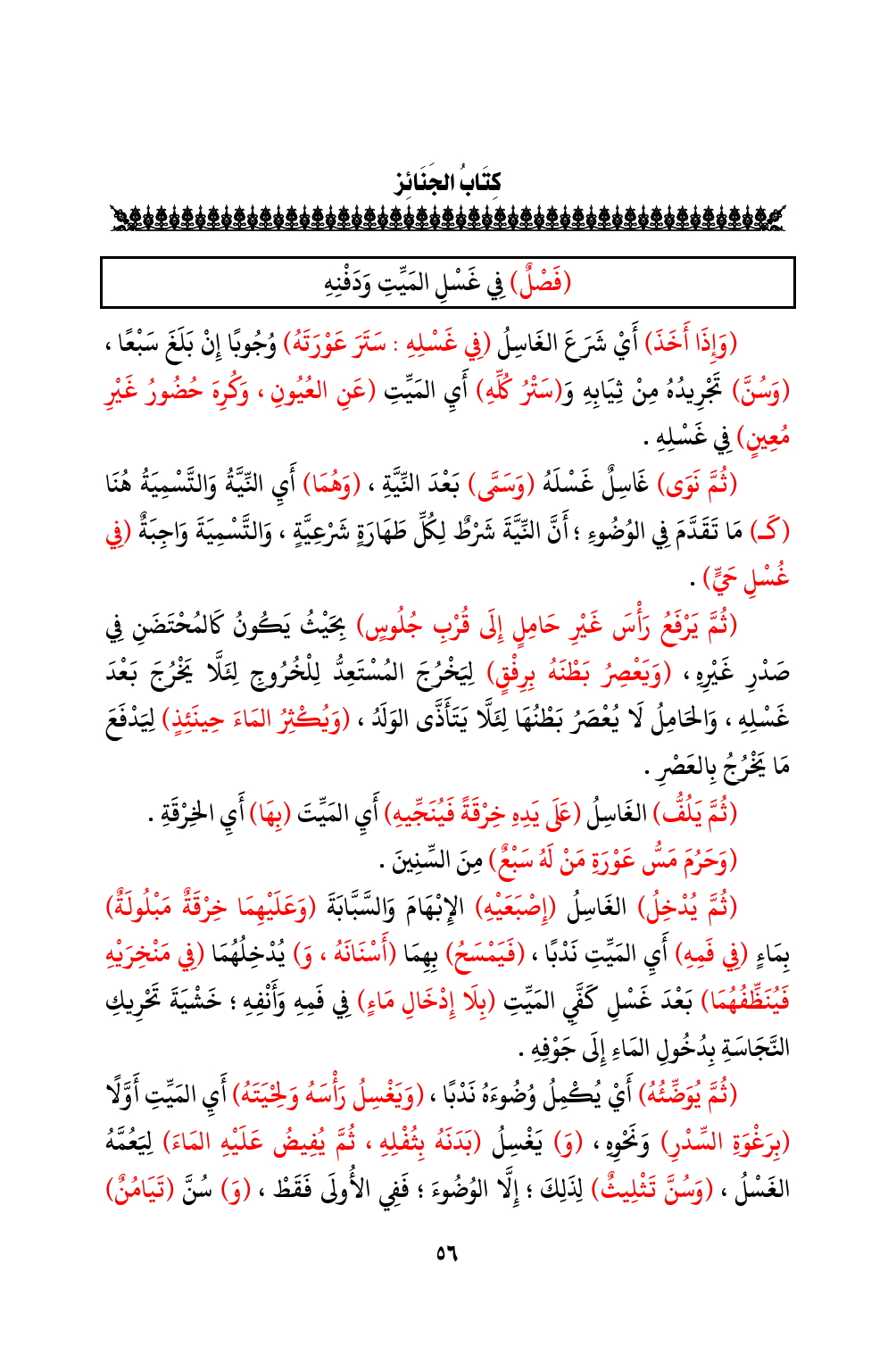 (وَإِذَا أَخَذَ) أَيْ شَرَعَ الغَاسِلُ (فِي غَسْلِهِ: سَتَرَ عَوْرَتَهُ) وُجُوبًا إِنْ بَلَغَ سَبْعًا، (وَسُنَّ) تَجْرِيدُهُ مِنْ ثِيَابِهِ وَ (سَتْرُ كُلِّهِ) أَيِ المَيِّتِ (عَنِ العُيُونِ، وَكُرِهَ حُضُورُ غَيْرِ مُعِينٍ) فِي غَسْلِهِ.
