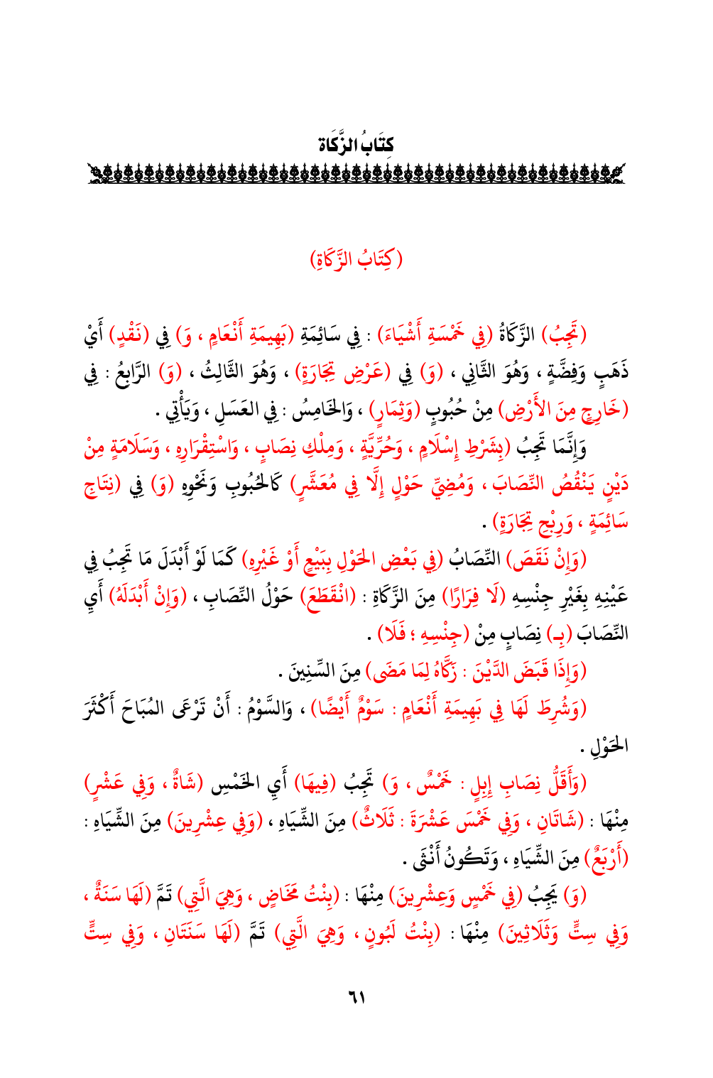 (تَجِبُ) الزَّكَاةُ (فِي خَمْسَةِ أَشْيَاءَ): فِي سَائِمَةِ (بَهِيمَةِ أَنْعَامٍ، وَ) فِي (نَقْدٍ) أَيْ ذَهَبٍ وَفِضَّةٍ، وَهُوَ الثَّانِي، (وَ) فِي (عَرْضِ تِجَارَةٍ)، وَهُوَ الثَّالِثُ، (وَ) الرَّابِعُ: فِي (خَارِجٍ مِنَ الأَرْضِ) مِنْ حُبُوبٍ (وَثِمَارٍ)، وَالخَامِسُ: فِي العَسَلِ، وَيَأْتِي.
