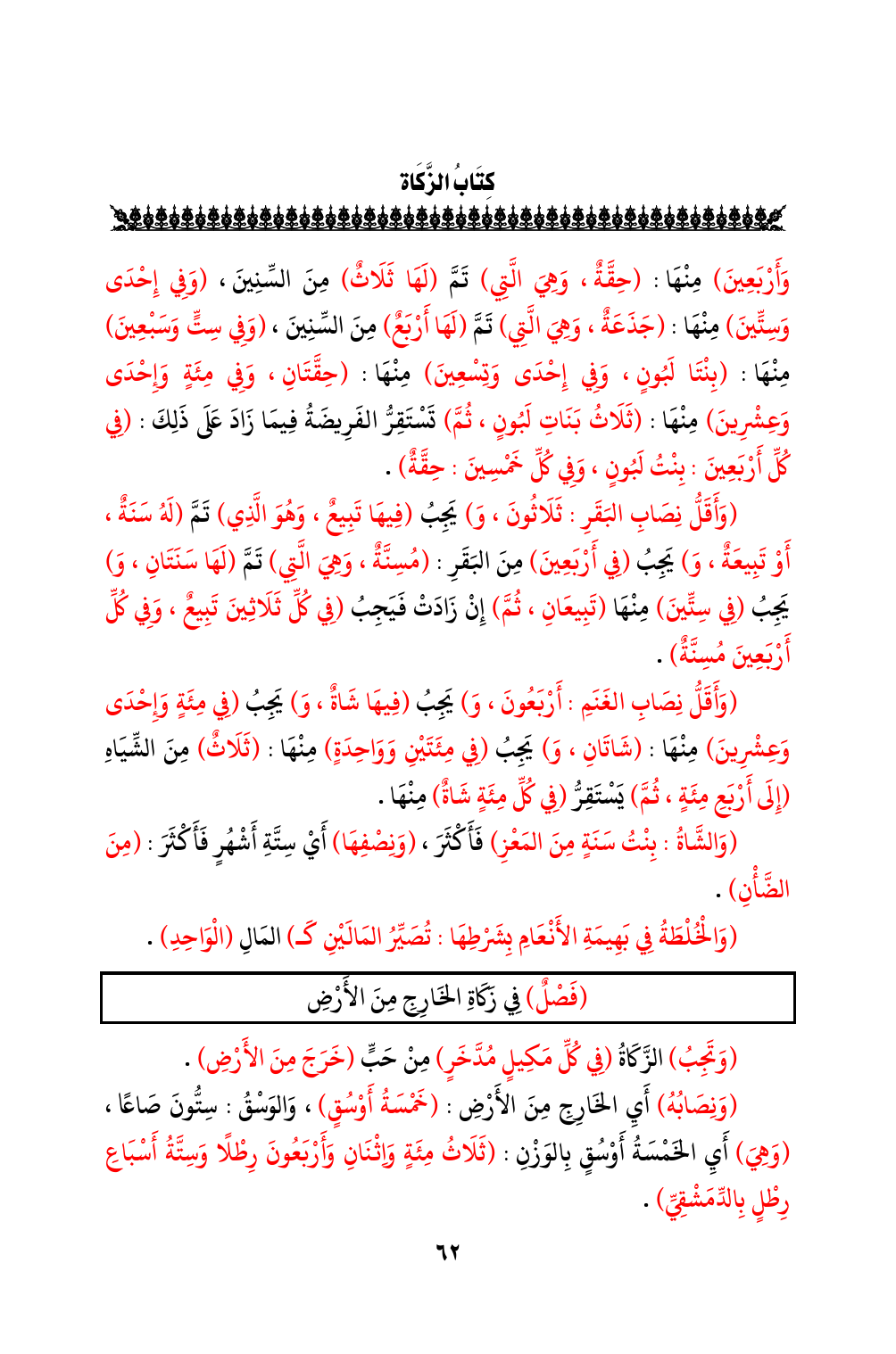 (وَنِصَابُهُ) أَيِ الخَارِجِ مِنَ الأَرْضِ: (خَمْسَةُ أَوْسُقٍ)، وَالوَسْقُ: سِتُّونَ صَاعًا، (وَهِيَ) أَيِ الخَمْسَةُ أَوْسُقٍ بِالوَزْنِ: (ثَلَاثُ مِئَةٍ وَاِثْنَانِ وَأَرْبَعُونَ رِطْلًا وَسِتَّةُ أَسْبَاعِ رِطْلٍ بِالدِّمَشْقِيِّ).