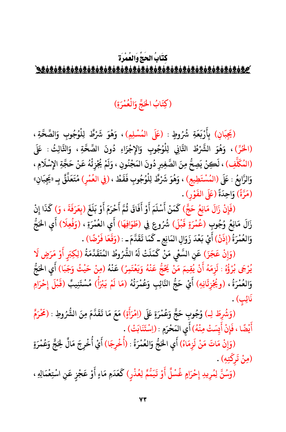 (يَجِبَانِ) بِأَرْبَعَةِ شُرُوطٍ: (عَلَى المُسْلِمِ)، وَهُوَ شَرْطٌ لِلْوُجُوبِ وَالصِّحَّةِ، (الحُرِّ)، وَهُوَ الشَّرْطُ الثَّانِي لِلْوُجُوبِ وَالإِجْزَاءِ دُونَ الصِّحَّةِ، وَالثَّالِثُ: عَلَى (المُكَلَّفِ)، لَكِنْ يَصِحُّ مِنَ الصَّغِيرِ دُونَ المَجْنُونِ، وَلَمْ يُجْزِئْهُ عَنْ حَجَّةِ الإِسْلَامِ، وَالرَّابِعُ: عَلَى (المُسْتَطِيعِ)، وَهُوَ شَرْطٌ لِلْوُجُوبِ فَقَطْ، (فِي العُمْرِ) مُتَعَلِّقٌ بِـ «يَجِبَانِ» (مَرَّةً) وَاحِدَةً (عَلَى الفَوْرِ).