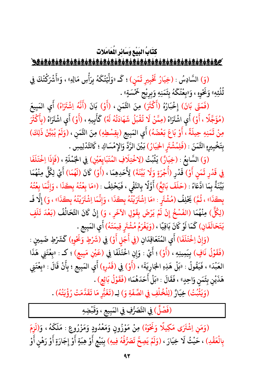 (وَ) السَّادِسُ: (خِيَارُ تَخْبِيرِ ثَمَنٍ)؛ كَـ «وَلَّيْتُكَهُ بِرَأْسِ مَالِهِ»، وَ «أَشْرَكْتُكَ فِي ثُلُثِهِ» وَنَحْوِهِ، وَ «بِعْتُكَهُ بِثَمَنِهِ وَبِرِبْحِ خَمْسَةٍ».