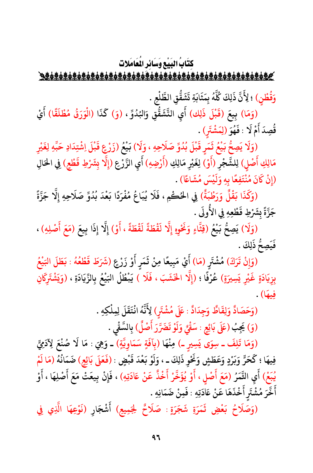 (وَلَا يَصِحُّ بَيْعُ ثَمَرٍ قَبْلَ بُدُوِّ صَلَاحِهِ، وَلَا) بَيْعُ (زَرْعٍ قَبْلَ اِشْتِدَادِ حَبِّهِ لِغَيْرِ مَالِكِ أَصْلٍ) لِلشَّجْرِ (أَوْ) لِغَيْرِ مَالِكِ (أَرْضِهِ) أَيِ الزَّرْعِ (إِلَّا بِشَرْطِ قَطْعٍ) فِي الحَالِ (إِنْ كَانَ مُنْتَفِعًا بِهِ وَلَيْسَ مُشَاعًا).
