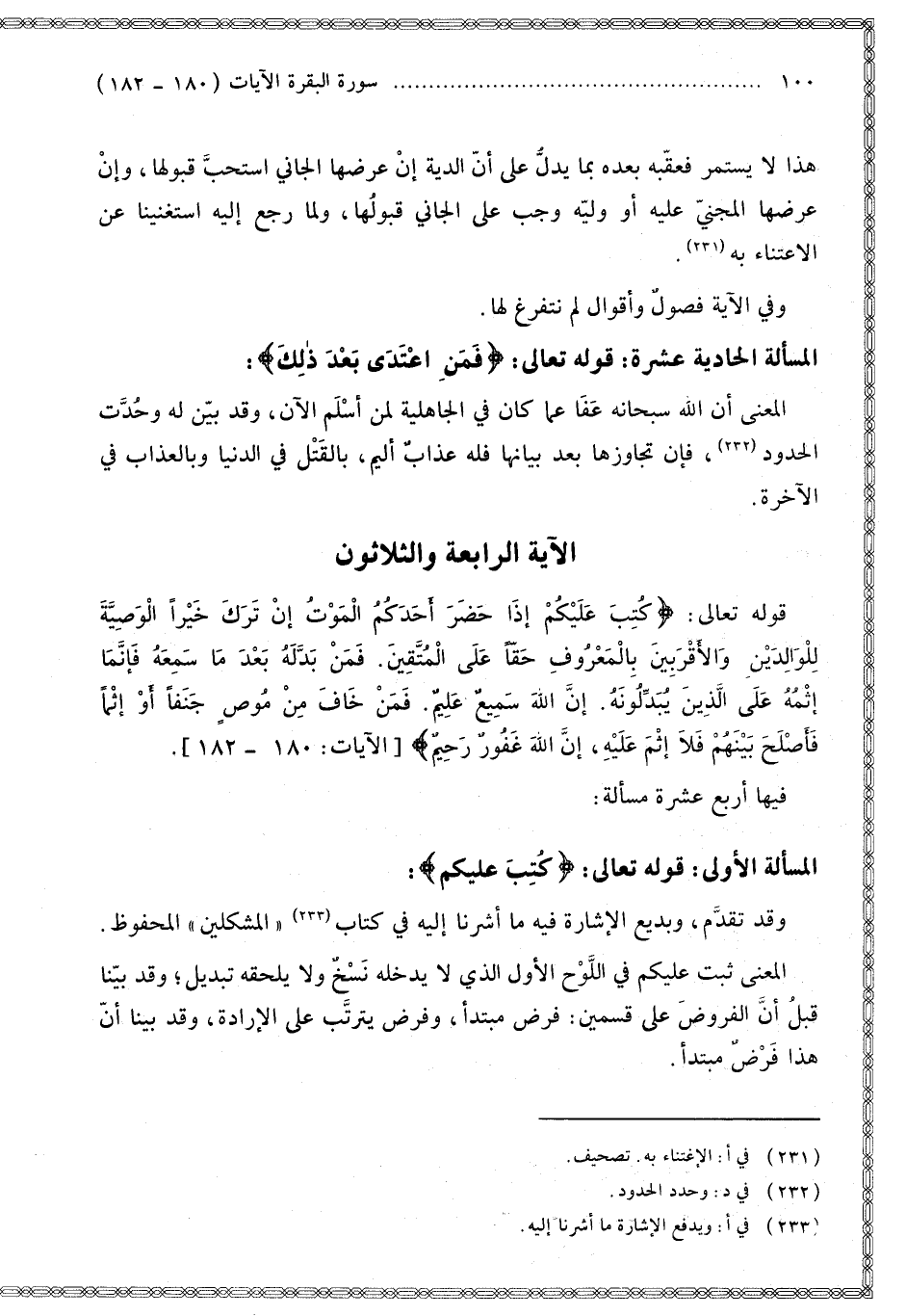 فِيهَا أَرْبَعَ عَشْرَةَ مَسْأَلَةً: الْمَسْأَلَةُ الْأُولَى: قَوْله تَعَالَى: {كُتِبَ عَلَيْكُمُ} [البقرة: 178]: وَقَدْ تَقَدَّمَ، وَبَدِيعُ الْإِشَارَةِ فِيهِ مَا أَشَرْنَا إلَيْهِ فِي كِتَابِ " الْمُشْكَلَيْنِ " الْمَحْفُوظِ الْمَعْنَى: ثَبَتَ عَلَيْكُمْ فِي اللَّوْحِ الْأَوَّلِ الَّذِي لَا يَدْخُلُهُ نَسْخٌ وَلَا يَلْحَقُهُ تَبْدِيلٌ؛ وَقَدْ بَيَّنَّا قَبْلُ أَنَّ الْفُرُوضَ عَلَى قِسْمَيْنِ: فَرْضٌ مُبْتَدَأٌ، وَفَرْضٌ يَتَرَتَّبُ عَلَى الْإِرَادَةِ، وَقَدْ بَيَّنَّا أَنَّ هَذَا فَرْضٌ مُبْتَدَأٌ.