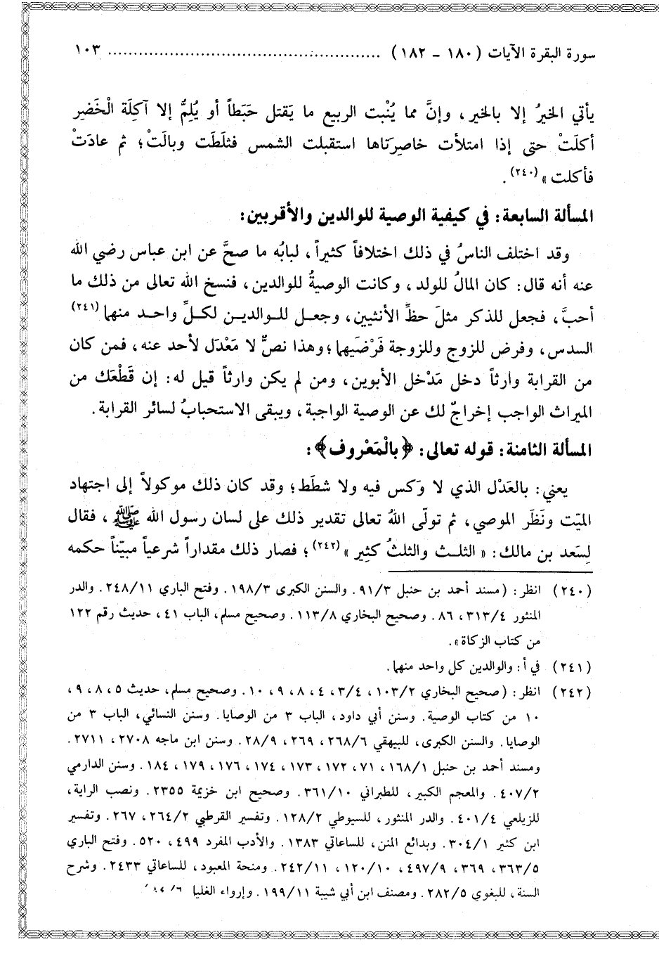 قَوْله تَعَالَى: {بِالْمَعْرُوفِ} [البقرة: 180]: يَعْنِي: بِالْعَدْلِ الَّذِي لَا وَكْسَ فِيهِ وَلَا شَطَطَ وَقَدْ كَانَ ذَلِكَ مَوْكُولًا إلَى اجْتِهَادِ الْمَيِّتِ وَنَظَرِ الْمُوصِي، ثُمَّ تَوَلَّى اللَّهُ تَعَالَى تَقْدِيرَ ذَلِكَ عَلَى لِسَانِ رَسُولِ اللَّهِ - صَلَّى اللَّهُ عَلَيْهِ وَسَلَّمَ - فَقَالَ لِسَعْدِ بْنِ مَالِكٍ: «الثُّلُثُ وَالثُّلُثُ كَثِيرٌ»؛ فَصَارَ ذَلِكَ مِقْدَارًا شَرْعِيًّا مُبَيَّنًا حُكْمُهُ