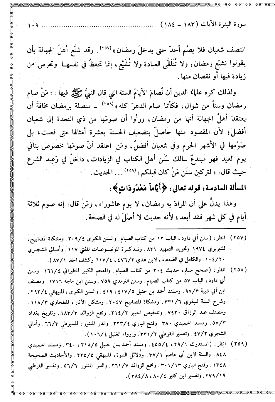 وَلِذَلِكَ كَرِهَ عُلَمَاءُ الدَّيْنِ أَنْ تُصَامَ الْأَيَّامُ السِّتَّةُ الَّتِي قَالَ النَّبِيُّ - صَلَّى اللَّهُ عَلَيْهِ وَسَلَّمَ - فِيهَا: «مَنْ صَامَ رَمَضَانَ وَسِتًّا مِنْ شَوَّالٍ، فَكَأَنَّمَا صَامَ الدَّهْرَ كُلَّهُ» مُتَّصِلَةً بِرَمَضَانَ مَخَافَةَ أَنْ يَعْتَقِدَ أَهْلُ الْجَهَالَةِ أَنَّهَا مِنْ رَمَضَانَ، وَرَأَوْا أَنَّ صَوْمَهَا مِنْ ذِي الْقَعْدَةِ إلَى شَعْبَانَ أَفْضَلُ؛ لِأَنَّ الْمَقْصُودَ مِنْهَا حَاصِلٌ بِتَضْعِيفِ الْحَسَنَةِ بِعَشْرَةِ أَمْثَالِهَا مَتَى فُعِلَتْ؛ بَلْ صَوْمُهَا فِي الْأَشْهُرِ الْحُرُمِ وَفِي شَعْبَانَ أَفْضَلُ، وَمَنْ اعْتَقَدَ أَنَّ صَوْمَهَا مَخْصُوصٌ بِثَانِي يَوْمِ الْعِيدِ فَهُوَ مُبْتَدِعٌ سَالِكٌ سُنَنَ أَهْلِ الْكِتَابِ فِي الزِّيَادَاتِ، دَاخِلٌ فِي وَعِيدِ الشَّرْعِ حَيْثُ قَالَ: «لَتَرْكَبُنَّ سَنَنَ مَنْ كَانَ قَبْلَكُمْ» الْحَدِيثَ.