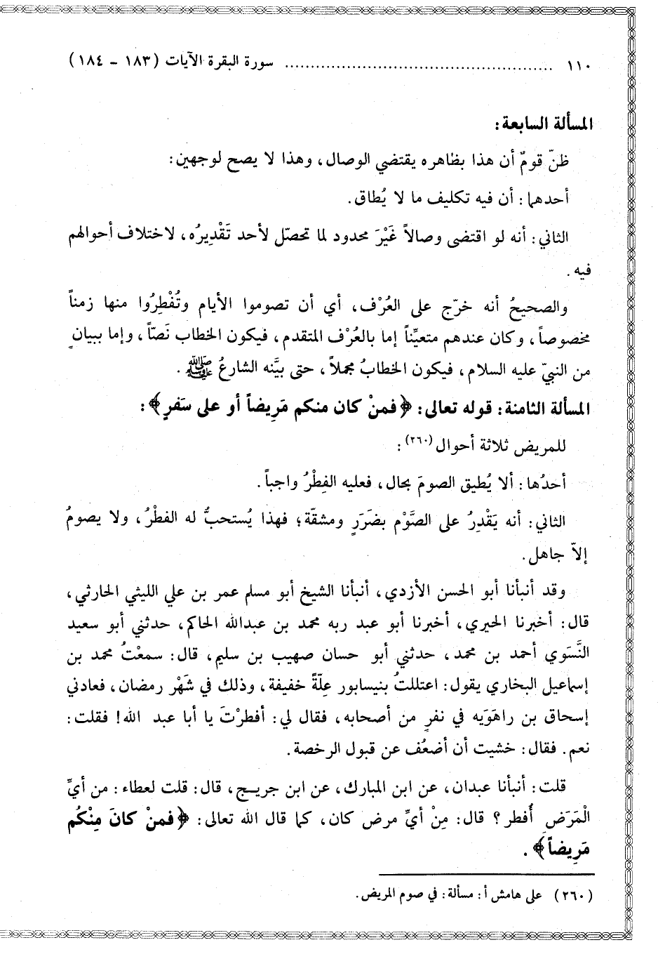 وَقَدْ أَنْبَأَنَا أَبُو الْحَسَنِ الْأَزْدِيُّ، أَنْبَأَنَا الشَّيْخُ أَبُو مُسْلِمٍ عُمَرُ بْنُ عَلِيٍّ اللَّيْثِيُّ الْحَارِثِيُّ قَالَ: أَخْبَرَنَا الْحِيرِيُّ، أَخْبَرَنَا أَبُو عَبْدِ رَبِّهِ مُحَمَّدُ بْنُ عَبْدِ اللَّهِ الْحَاكِمُ، حَدَّثَنِي أَبُو سَعِيدٍ النَّسَوِيُّ أَحْمَدُ بْنُ مُحَمَّدٍ، حَدَّثَنِي أَبُو حَسَّانَ صُهَيْبُ بْنُ سُلَيْمٍ قَالَ: سَمِعْت مُحَمَّدَ بْنَ إسْمَاعِيلَ الْبُخَارِيَّ يَقُولُ: اعْتَلَلْت بِنَيْسَابُورَ عِلَّةً خَفِيفَةً، وَذَلِكَ فِي شَهْرِ رَمَضَانَ، فَعَادَنِي إِسْحَاقُ بْنُ رَاهْوَيْهِ فِي نَفَرٍ مِنْ أَصْحَابِهِ، فَقَالَ لِي: أَفْطَرْت يَا أَبَا عَبْدِ اللَّهِ، فَقُلْت: نَعَمْ فَقَالَ: خَشِيتُ أَنْ أَضْعُفَ عَنْ قَبُولِ الرُّخْصَةِ قُلْت: أَنْبَأَنَا عَبْدَانُ عَنْ ابْنِ الْمُبَارَكِ عَنْ ابْنِ جُرَيْجٍ قَالَ: قُلْت لِعَطَاءٍ: مِنْ أَيِّ الْمَرَضِ أُفْطِرُ؟ قَالَ: مِنْ أَيِّ مَرَضٍ كَانَ، كَمَا قَالَ اللَّهُ تَعَالَى: {فَمَنْ كَانَ مِنْكُمْ مَرِيضًا} [البقرة: 184]