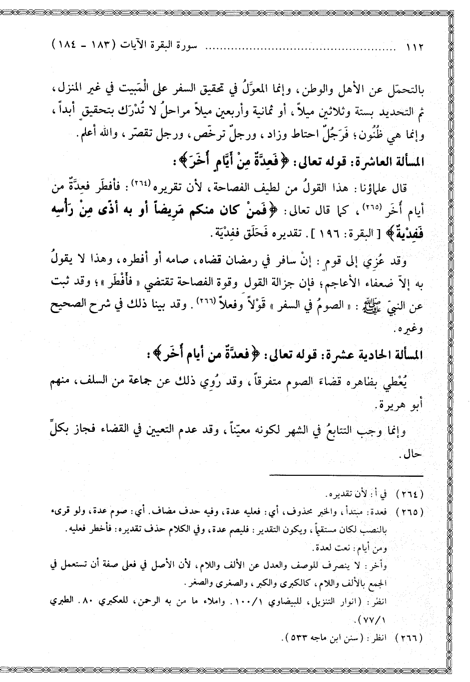 قَوْله تَعَالَى: {فَعِدَّةٌ مِنْ أَيَّامٍ أُخَرَ} [البقرة: 184]: قَالَ عُلَمَاؤُنَا: هَذَا الْقَوْلُ مِنْ لَطِيفِ الْفَصَاحَةِ، لِأَنَّ تَقْرِيرَهُ: فَأَفْطَرَ فَعِدَّةٌ مِنْ أَيَّامٍ أُخَرَ، كَمَا قَالَ تَعَالَى: {فَمَنْ كَانَ مِنْكُمْ مَرِيضًا أَوْ بِهِ أَذًى مِنْ رَأْسِهِ فَفِدْيَةٌ} [البقرة: 196] تَقْدِيرُهُ فَحَلَقَ فَفِدْيَةٌ.