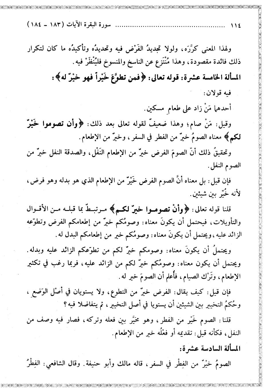 الْمَسْأَلَةُ الْخَامِسَةَ عَشْرَةَ قَوْله تَعَالَى: {فَمَنْ تَطَوَّعَ خَيْرًا فَهُوَ خَيْرٌ لَهُ} [البقرة: 184]: فِيهِ قَوْلَانِ: أَحَدُهُمَا مَنْ زَادَ عَلَى طَعَامِ مِسْكِينٍ، وَقِيلَ: مَنْ صَامَ؛ وَهَذَا ضَعِيفٌ لِقَوْلِهِ تَعَالَى بَعْدَ ذَلِكَ: {وَأَنْ تَصُومُوا خَيْرٌ لَكُمْ} [البقرة: 184] مَعْنَاهُ الصَّوْمُ خَيْرٌ مِنْ الْفِطْرِ فِي السَّفَرِ، وَخَيْرٌ مِنْ الْإِطْعَامِ.