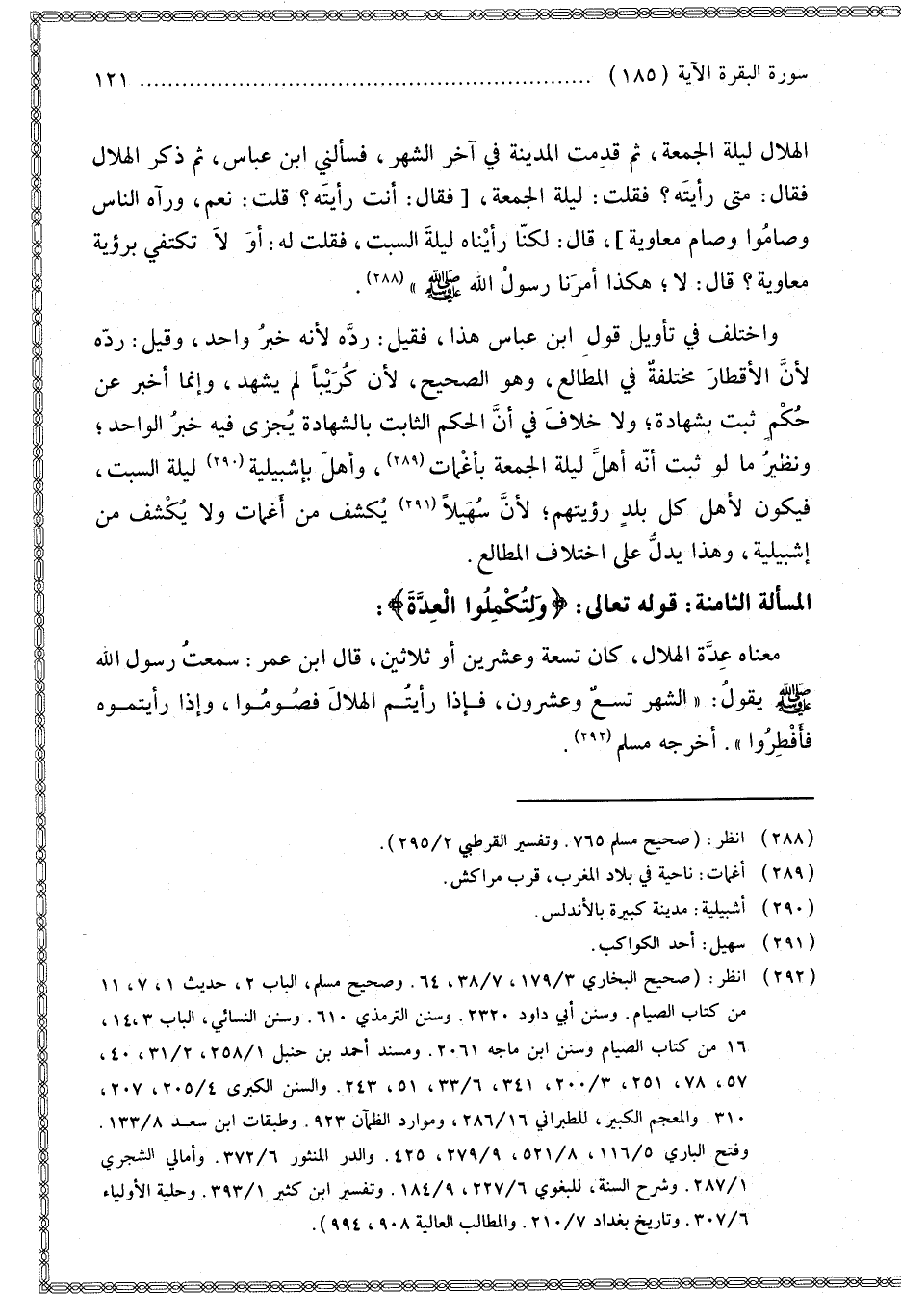 الْمَسْأَلَةُ الثَّامِنَةُ قَوْله تَعَالَى: {وَلِتُكْمِلُوا الْعِدَّةَ} [البقرة: 185]: مَعْنَاهُ عِدَّةُ الْهِلَالِ، كَانَ تِسْعَةً وَعِشْرِينَ أَوْ ثَلَاثِينَ، قَالَ ابْنُ عُمَرَ: سَمِعْت رَسُولَ اللَّهِ - صَلَّى اللَّهُ عَلَيْهِ وَسَلَّمَ - يَقُولُ: «الشَّهْرُ تِسْعٌ وَعِشْرُونَ، فَإِذَا رَأَيْتُمْ الْهِلَالَ فَصُومُوا، وَإِذَا رَأَيْتُمُوهُ فَأَفْطِرُوا» أَخْرَجَهُ مُسْلِمٌ.
