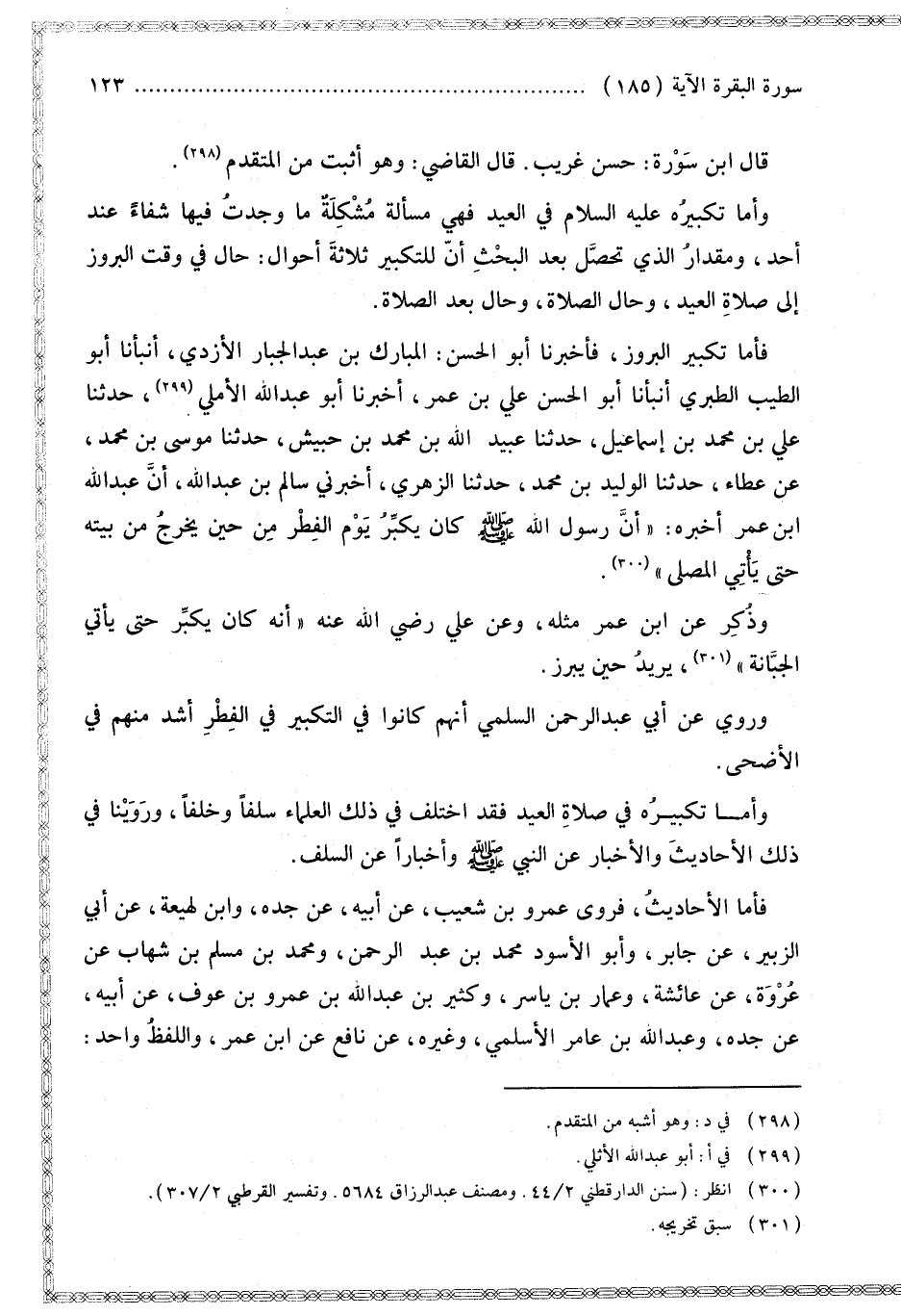فَأَمَّا تَكْبِيرُ الْبُرُوزِ، فَأَخْبَرَنَا أَبُو الْحَسَنِ الْمُبَارَكُ بْنُ عَبْدِ الْجَبَّارِ الْأَزْدِيُّ، أَنْبَأَنَا أَبُو الطَّيِّبِ الطَّبَرِيُّ أَنْبَأَنَا أَبُو الْحَسَنِ عَلِيُّ بْنُ عُمَرَ، أَخْبَرَنَا أَبُو عَبْدِ اللَّهِ الْأَمْلِيُّ، حَدَّثَنَا عَلِيُّ بْنُ مُحَمَّدِ بْنِ إسْمَاعِيلَ، حَدَّثَنَا عُبَيْدُ اللَّهِ بْنُ مُحَمَّدِ بْنِ حُبَيْشٍ، حَدَّثَنَا مُوسَى بْنُ مُحَمَّدٍ عَنْ عَطَاءٍ، حَدَّثَنَا الْوَلِيدُ بْنُ مُحَمَّدٍ، حَدَّثَنَا الزُّهْرِيُّ، أَخْبَرَنِي سَالِمُ بْنُ عَبْدِ اللَّهِ أَنَّ عَبْدَ اللَّهِ بْنَ عُمَرَ أَخْبَرَهُ: «أَنَّ رَسُولَ اللَّهِ - صَلَّى اللَّهُ عَلَيْهِ وَسَلَّمَ - كَانَ يُكَبِّرُ يَوْمَ الْفِطْرِ مِنْ حِينِ يَخْرُجُ مِنْ بَيْتِهِ حَتَّى يَأْتِيَ الْمُصَلَّى».
