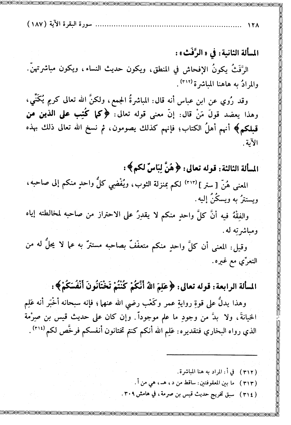 فِي " الرَّفَثِ ": الرَّفَثُ يَكُونُ الْإِفْحَاشَ فِي الْمَنْطِقِ، وَيَكُونُ حَدِيثَ النِّسَاءِ، وَيَكُونُ مُبَاشَرَتَهُنَّ، وَالْمُرَادُ بِهِ هَاهُنَا الْمُبَاشَرَةُ.