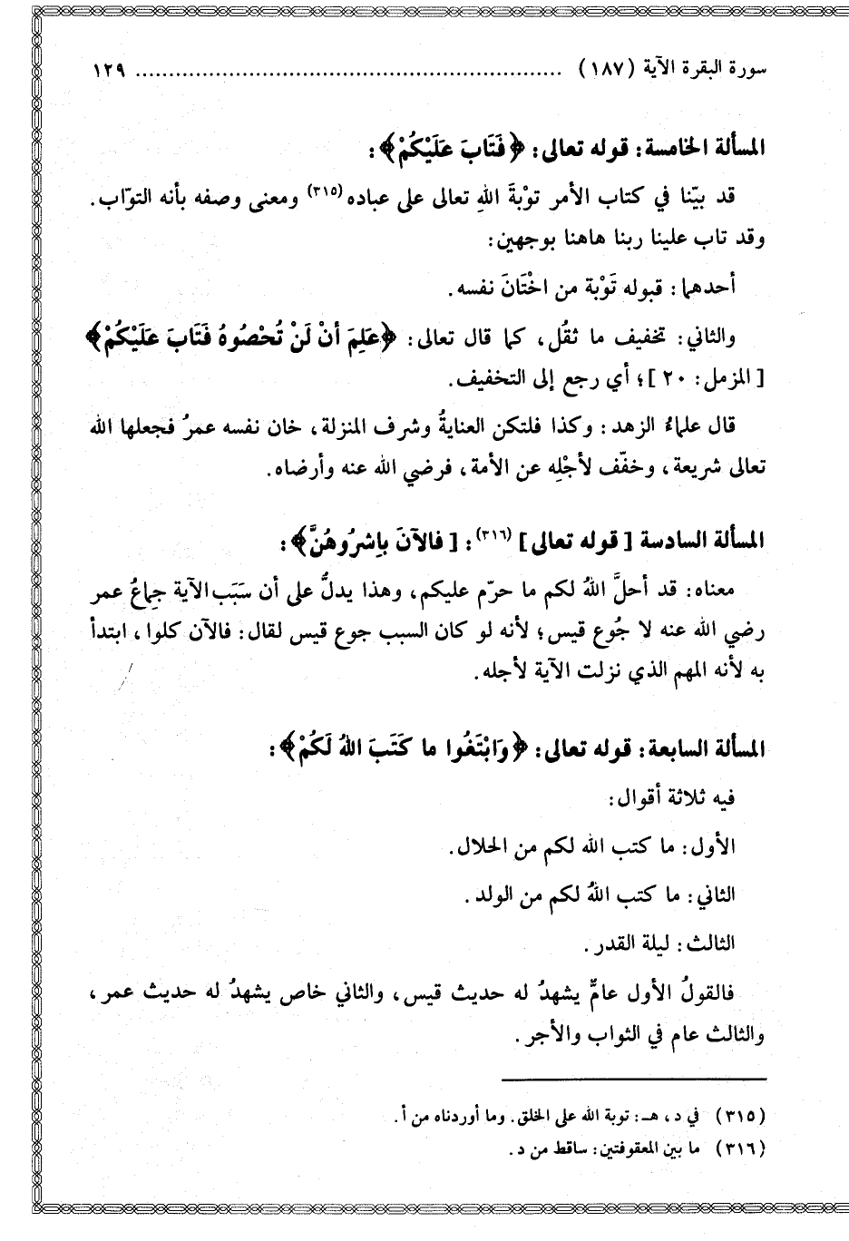 قَوْله تَعَالَى: {فَتَابَ عَلَيْكُمْ} [البقرة: 187] قَدْ بَيَّنَّا فِي كِتَابِ الْأَمْرِ تَوْبَةَ اللَّهِ تَعَالَى عَلَى عِبَادِهِ وَمَعْنَى وَصْفِهِ بِأَنَّهُ التَّوَّابُ، وَقَدْ تَابَ عَلَيْنَا رَبُّنَا هَاهُنَا بِوَجْهَيْنِ: أَحَدُهُمَا: قَبُولُهُ تَوْبَةَ مَنْ اخْتَانَ نَفْسَهُ.