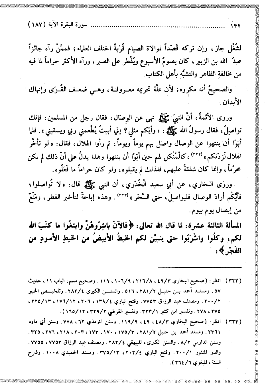 الْمَسْأَلَةُ الثَّالِثَةَ عَشْرَةَ لَمَّا قَالَ اللَّهُ تَعَالَى: {فَالآنَ بَاشِرُوهُنَّ وَابْتَغُوا مَا كَتَبَ اللَّهُ لَكُمْ وَكُلُوا وَاشْرَبُوا حَتَّى يَتَبَيَّنَ لَكُمُ الْخَيْطُ الأَبْيَضُ مِنَ الْخَيْطِ الأَسْوَدِ مِنَ الْفَجْرِ} [البقرة: 187]: