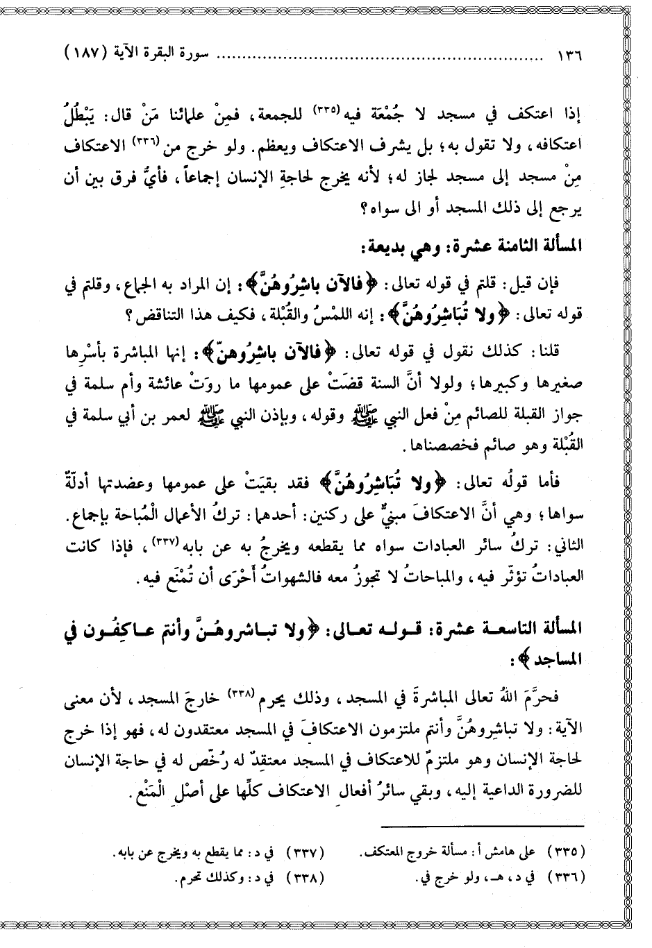 الْمَسْأَلَةُ التَّاسِعَةَ عَشْرَةَ قَوْله تَعَالَى: {وَلا تُبَاشِرُوهُنَّ وَأَنْتُمْ عَاكِفُونَ فِي الْمَسَاجِدِ} [البقرة: 187]: فَحَرَّمَ اللَّهُ تَعَالَى الْمُبَاشَرَةَ فِي الْمَسْجِدِ، وَذَلِكَ يَحْرُمُ خَارِجَ الْمَسْجِدِ؛ لِأَنَّ مَعْنَى الْآيَةِ: وَلَا تُبَاشِرُوهُنَّ وَأَنْتُمْ مُلْتَزِمُونَ الِاعْتِكَافَ فِي الْمَسْجِدِ مُعْتَقِدُونَ لَهُ، فَهُوَ إذَا خَرَجَ لِحَاجَةِ الْإِنْسَانِ، وَهُوَ مُلْتَزِمٌ لِلِاعْتِكَافِ فِي الْمَسْجِدِ مُعْتَقِدٌ لَهُ رَخَّصَ لَهُ فِي حَاجَةِ الْإِنْسَانِ لِلضَّرُورَةِ الدَّاعِيَةِ إلَيْهِ، وَبَقِيَ سَائِرُ أَفْعَالِ الِاعْتِكَافِ كُلِّهَا عَلَى أَصْلِ الْمَنْعِ.