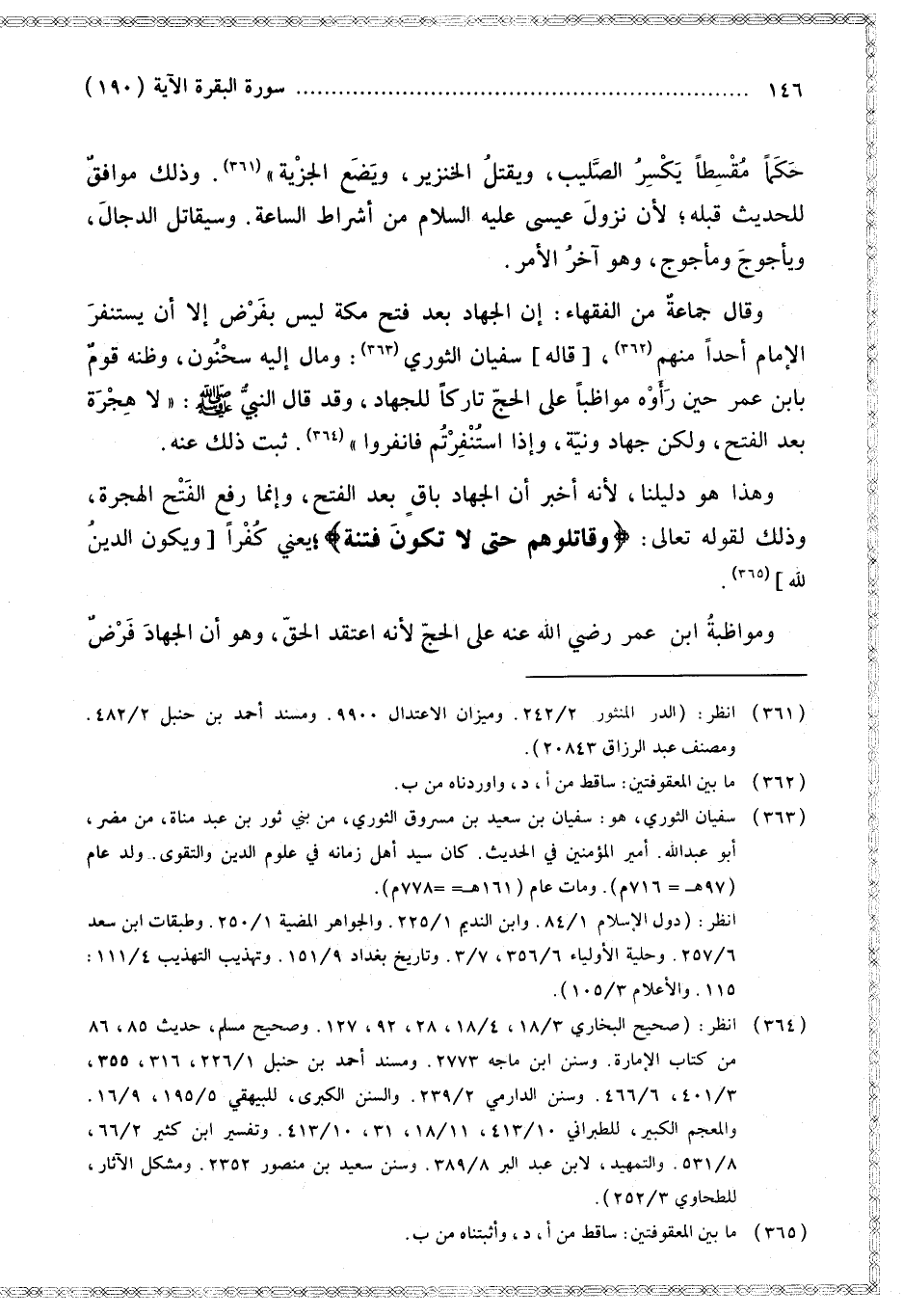 وَقَالَ جَمَاعَةٌ مِنْ الْفُقَهَاءِ: إنَّ الْجِهَادَ بَعْدَ فَتْحِ مَكَّةَ لَيْسَ بِفَرْضٍ إلَّا أَنْ يَسْتَنْفِرَ الْإِمَامُ أَحَدًا مِنْهُمْ قَالَهُ سُفْيَانُ الثَّوْرِيُّ: وَمَالَ إلَيْهِ سَحْنُونٌ، وَظَنَّهُ قَوْمٌ بِابْنِ عُمَرَ حِينَ رَأَوْهُ مُوَاظِبًا عَلَى الْحَجِّ تَارِكًا لِلْجِهَادِ، وَقَدْ قَالَ النَّبِيُّ - صَلَّى اللَّهُ عَلَيْهِ وَسَلَّمَ -: «لَا هِجْرَةَ بَعْدَ الْفَتْحِ، وَلَكِنْ جِهَادٌ وَنِيَّةٌ، وَإِذَا اُسْتُنْفِرْتُمْ فَانْفِرُوا». ثَبَتَ ذَلِكَ عَنْهُ.