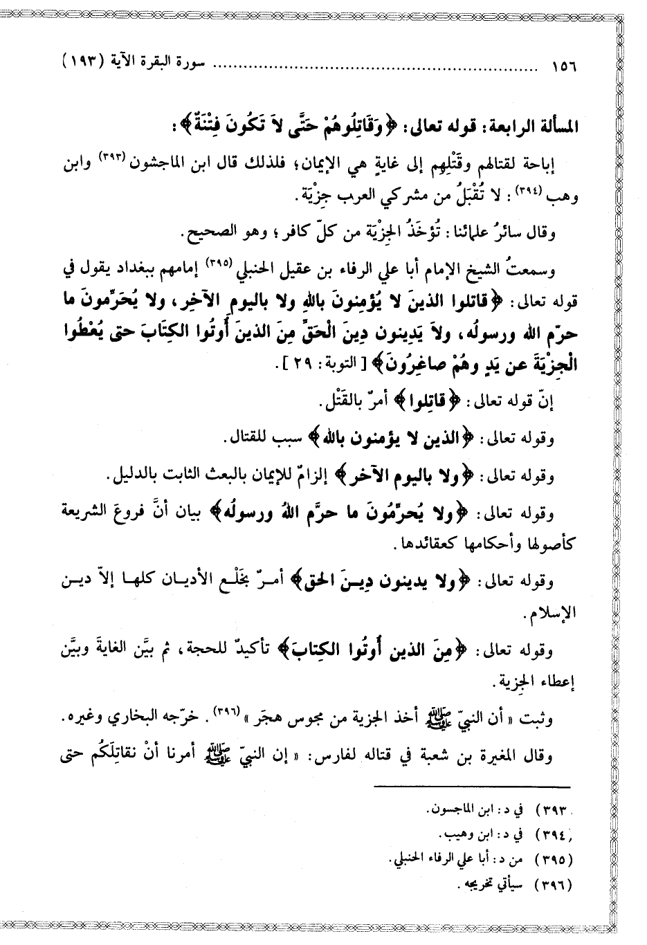 الْمَسْأَلَةُ الرَّابِعَةُ: قَوْله تَعَالَى {وَقَاتِلُوهُمْ حَتَّى لا تَكُونَ فِتْنَةٌ} [البقرة: 193]: إبَاحَةٌ لِقِتَالِهِمْ وَقَتْلِهِمْ إلَى غَايَةٍ هِيَ الْإِيمَانُ؛ فَلِذَلِكَ قَالَ ابْنُ الْمَاجِشُونِ وَابْنُ وَهْبٍ: لَا تُقْبَلُ مِنْ مُشْرِكِي الْعَرَبِ جِزْيَةٌ.