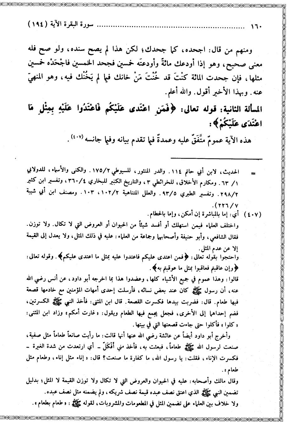الْمَسْأَلَةُ الثَّانِيَةُ: قَوْله تَعَالَى: {فَمَنِ اعْتَدَى عَلَيْكُمْ فَاعْتَدُوا عَلَيْهِ بِمِثْلِ مَا اعْتَدَى عَلَيْكُمْ} [البقرة: 194]: هَذِهِ الْآيَةُ عُمُومٌ مُتَّفَقٌ عَلَيْهِ وَعُمْدَةٌ فِيمَا تَقَدَّمَ بَيَانُهُ وَفِيمَا جَانَسَهُ.