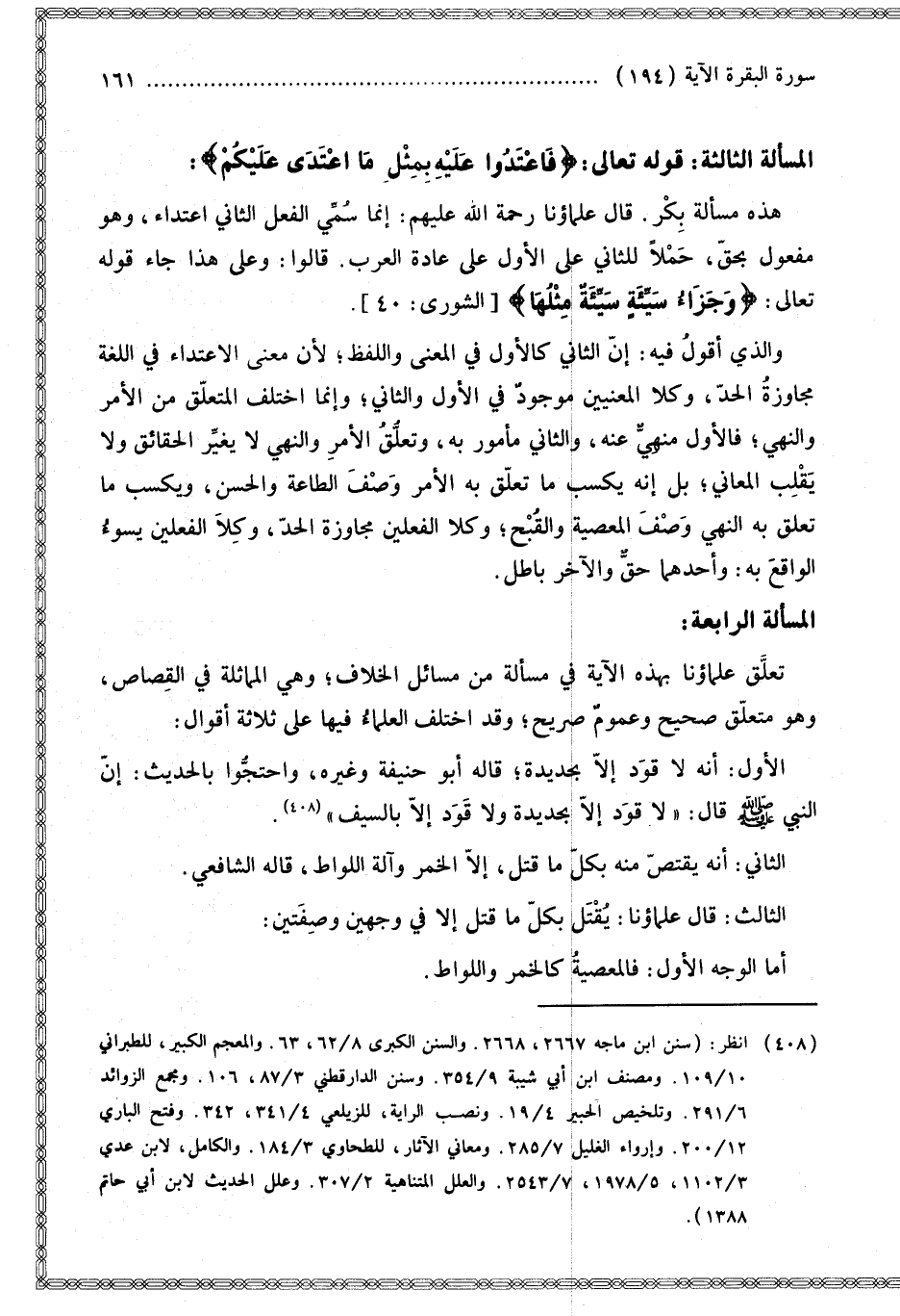 قَالُوا: وَعَلَى هَذَا جَاءَ قَوْله تَعَالَى: {وَجَزَاءُ سَيِّئَةٍ سَيِّئَةٌ مِثْلُهَا} [الشورى: 40]. وَاَلَّذِي أَقُولُ فِيهِ: إنَّ الثَّانِيَ كَالْأَوَّلِ فِي الْمَعْنَى وَاللَّفْظِ؛ لِأَنَّ مَعْنَى الِاعْتِدَاءِ فِي اللُّغَةِ مُجَاوَزَةُ الْحَدِّ، وَكِلَا الْمَعْنَيَيْنِ مَوْجُودٌ فِي الْأَوَّلِ وَالثَّانِي؛ وَإِنَّمَا اخْتَلَفَ الْمُتَعَلِّقُ مِنْ الْأَمْرِ وَالنَّهْيِ؛ فَالْأَوَّلُ مَنْهِيٌّ عَنْهُ، وَالثَّانِي مَأْمُورٌ بِهِ، وَتَعَلُّقُ الْأَمْرِ وَالنَّهْيِ لَا يُغَيِّرُ الْحَقَائِقَ وَلَا يَقْلِبُ الْمَعَانِيَ؛ بَلْ إنَّهُ يُكْسِبُ مَا تَعَلَّقَ بِهِ الْأَمْرُ وَصْفَ الطَّاعَةِ وَالْحُسْنِ، وَيُكْسِبُ مَا تَعَلَّقَ بِهِ النَّهْيُ وَصْفَ الْمَعْصِيَةِ وَالْقُبْحِ؛ وَكِلَا الْفِعْلَيْنِ مُجَاوَزَةُ الْحَدِّ، وَكِلَا الْفِعْلَيْنِ يَسُوءُ الْوَاقِعُ بِهِ: وَأَحَدُهُمَا حَقٌّ وَالْآخَرُ بَاطِلٌ.