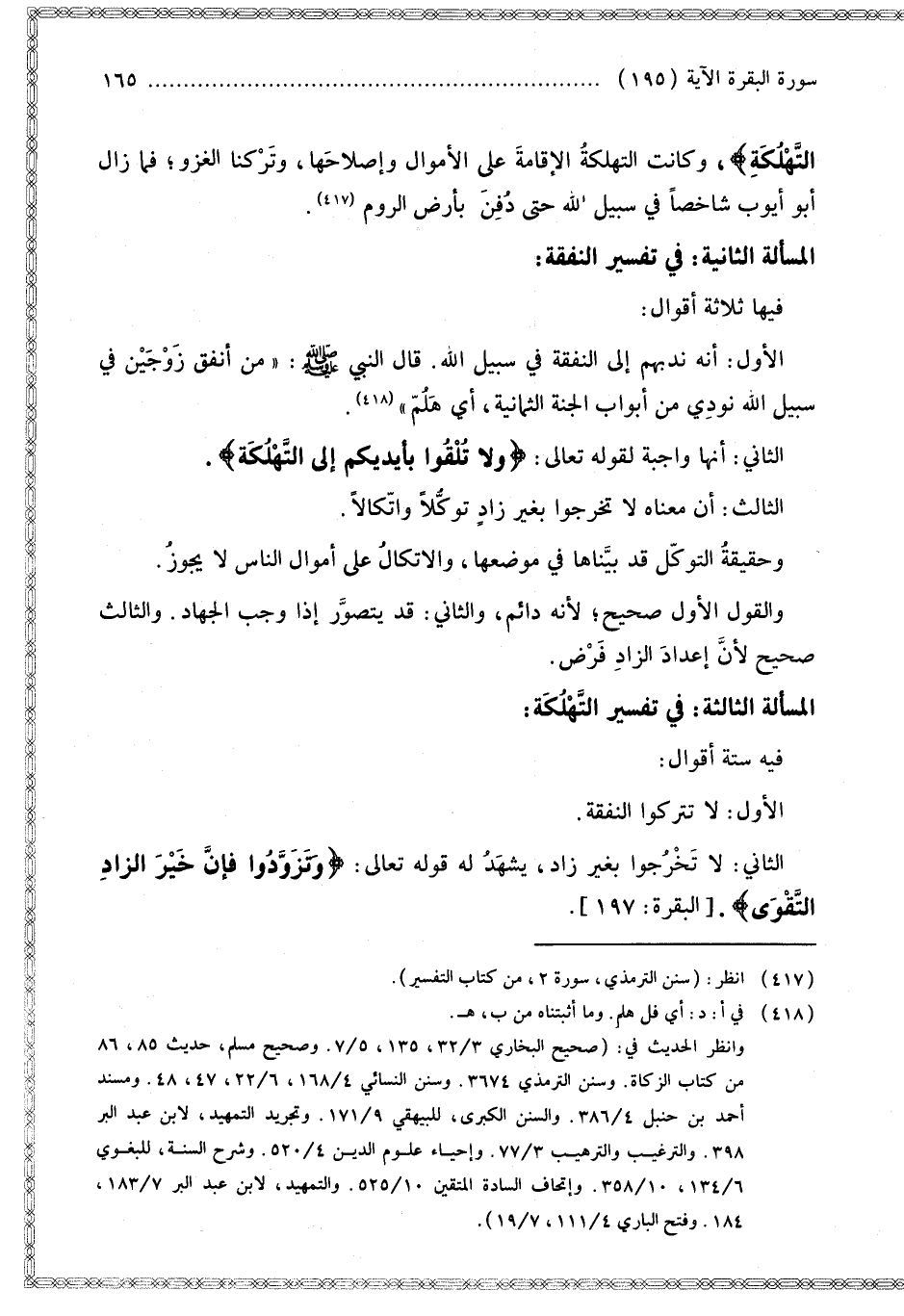 الْمَسْأَلَةُ الثَّالِثَةُ: فِي تَفْسِيرِ التَّهْلُكَةِ: فِيهِ سِتَّةُ أَقْوَالٍ: الْأَوَّلُ: لَا تَتْرُكُوا النَّفَقَةَ.