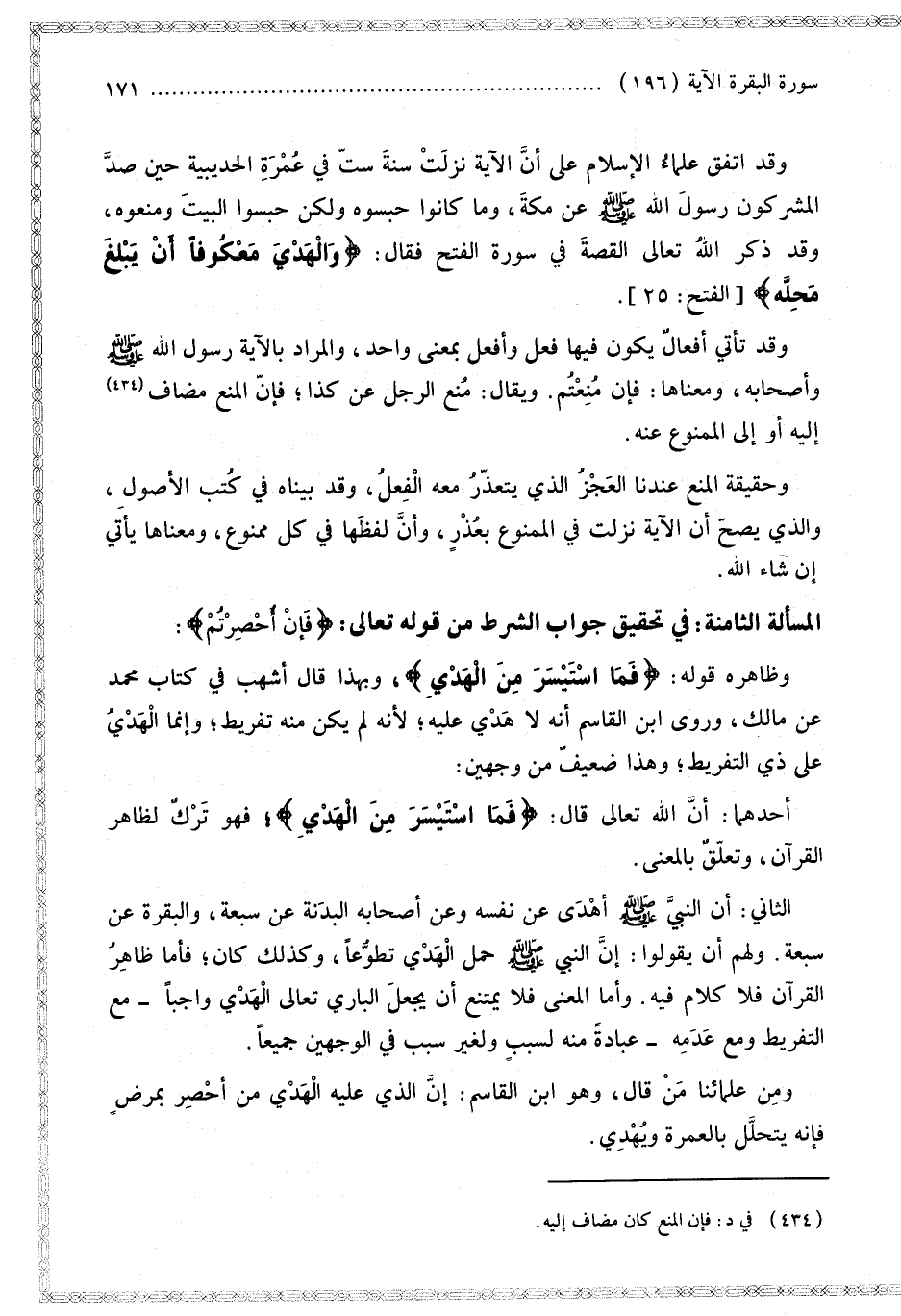 وَقَدْ اتَّفَقَ عُلَمَاءُ الْإِسْلَامِ عَلَى أَنَّ الْآيَةَ نَزَلَتْ سَنَةَ سِتٍّ فِي عُمْرَةِ الْحُدَيْبِيَةِ حِينَ صَدَّ الْمُشْرِكُونَ رَسُولَ اللَّهِ - صَلَّى اللَّهُ عَلَيْهِ وَسَلَّمَ - عَنْ مَكَّةَ، وَمَا كَانُوا حَبَسُوهُ وَلَكِنْ حَبَسُوا الْبَيْتَ وَمَنَعُوهُ، وَقَدْ ذَكَرَ اللَّهُ تَعَالَى الْقِصَّةَ فِي سُورَةِ الْفَتْحِ فَقَالَ: {وَالْهَدْيَ مَعْكُوفًا أَنْ يَبْلُغَ مَحِلَّهُ} [الفتح: 25].