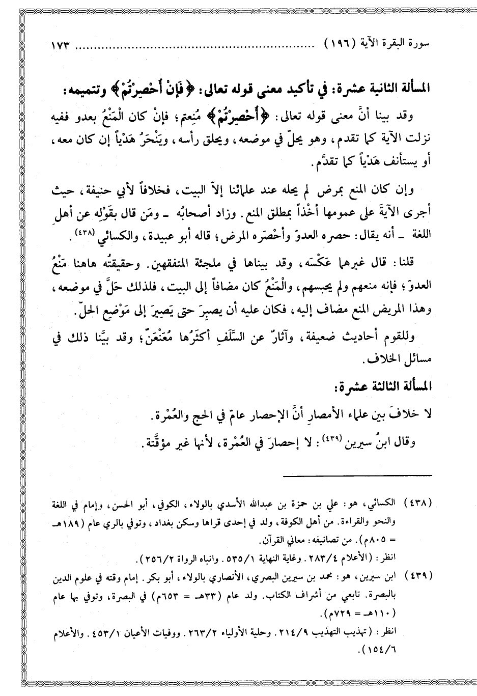 الْمَسْأَلَةُ الثَّالِثَةَ عَشْرَةَ: لَا خِلَافَ بَيْنَ عُلَمَاءِ الْأَمْصَارِ أَنَّ الْإِحْصَارَ عَامٌّ فِي الْحَجِّ وَالْعُمْرَةِ، وَقَالَ ابْنُ سِيرِينَ: لَا إحْصَارَ فِي الْعُمْرَةِ؛ لِأَنَّهَا غَيْرُ مُؤَقَّتَةٍ.