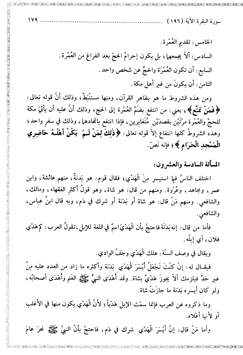 الْمَسْأَلَةُ السَّادِسَةُ وَالْعِشْرُونَ: اخْتَلَفَ النَّاسُ فِيمَا اسْتَيْسَرَ مِنْ الْهَدْيِ فَقَالَ قَوْمٌ: هُوَ بَدَنَةٌ، مِنْهُمْ عَائِشَةُ، وَابْنُ عُمَرَ، وَمُجَاهِدٌ، وَعُرْوَةُ. وَمِنْهُمْ مَنْ قَالَ: هُوَ شَاةٌ، وَهُوَ قَوْلُ أَكْثَرِ الْفُقَهَاءِ، وَمَالِكٍ، وَالشَّافِعِيِّ. وَمِنْهُمْ مَنْ قَالَ: هُوَ شَاةٌ أَوْ بَدَنَةٌ أَوْ شِرْكٌ فِي دَمٍ، وَبِهِ قَالَ ابْنُ عَبَّاسٍ، وَالشَّافِعِيُّ.