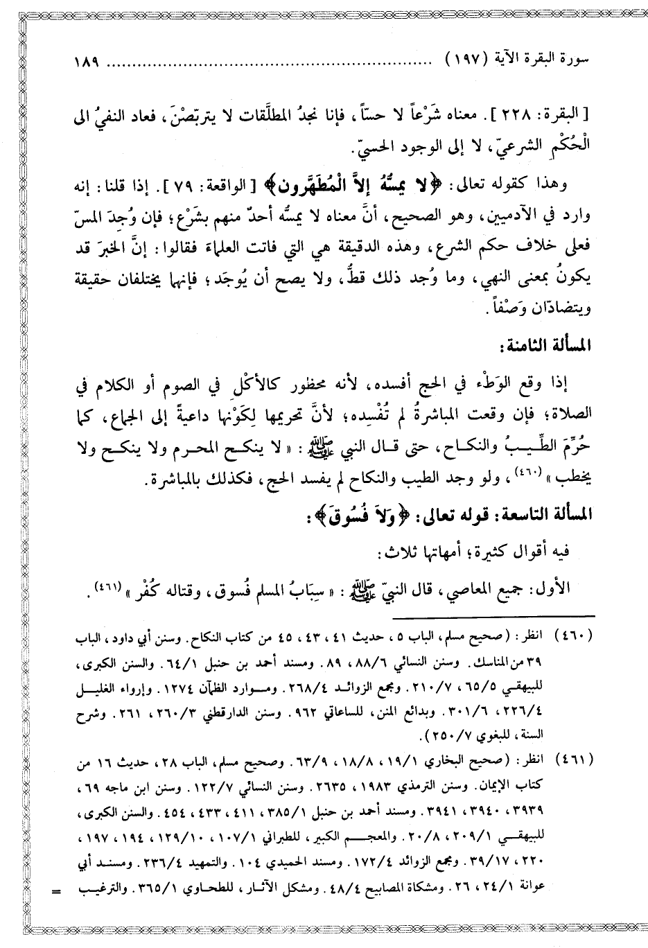 الْمَسْأَلَةُ التَّاسِعَةُ: قَوْله تَعَالَى: {وَلا فُسُوقَ} [البقرة: 197]: فِيهِ أَقْوَالٌ كَثِيرَةٌ؛ أُمَّهَاتُهَا ثَلَاثٌ: الْأَوَّلُ: جَمِيعُ الْمَعَاصِي قَالَ النَّبِيُّ - صَلَّى اللَّهُ عَلَيْهِ وَسَلَّمَ -: «سِبَابُ الْمُسْلِمِ فُسُوقٌ، وَقِتَالُهُ كُفْرٌ».