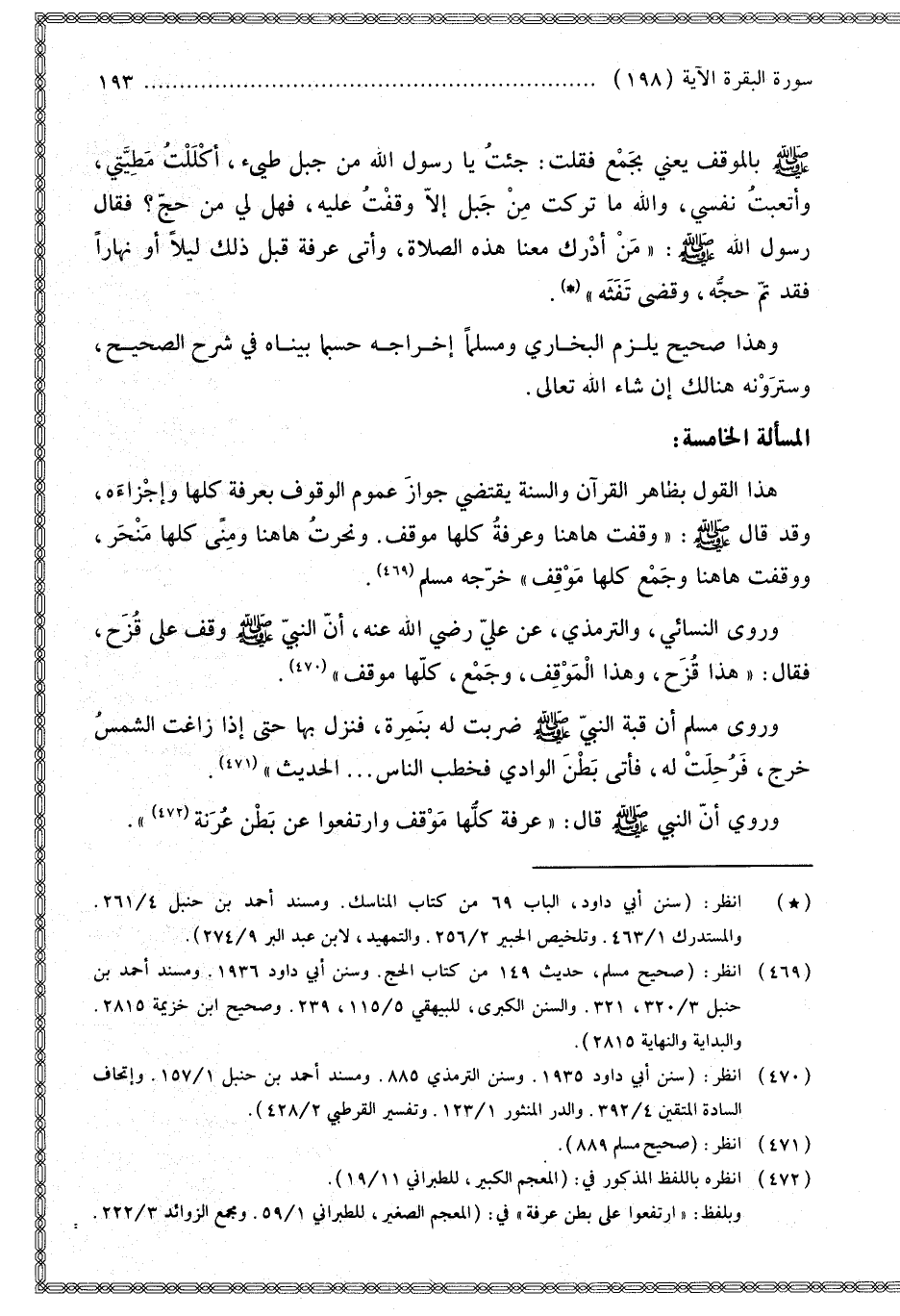 الْمَسْأَلَةُ الْخَامِسَةُ: هَذَا الْقَوْلُ بِظَاهِرِ الْقُرْآنِ وَالسُّنَّةِ يَقْتَضِي جَوَازَ عُمُومِ الْوُقُوفِ بِعَرَفَةَ كُلِّهَا وَإِجْزَاءَهُ، وَقَدْ «قَالَ - صَلَّى اللَّهُ عَلَيْهِ وَسَلَّمَ -: وَقَفْت هَاهُنَا وَعَرَفَةُ كُلُّهَا مَوْقِفٌ. وَنَحَرْت هَاهُنَا وَمِنًى كُلُّهَا مَنْحَرٌ، وَوَقَفْت هَاهُنَا وَجَمْعٌ كُلُّهَا مَوْقِفٌ» خَرَّجَهُ مُسْلِمٌ.