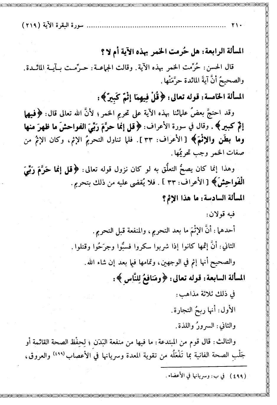 الْمَسْأَلَةُ الرَّابِعَةُ: هَلْ حُرِّمَتْ الْخَمْرُ بِهَذِهِ الْآيَةِ أَمْ لَا؟ قَالَ الْحَسَنُ: حُرِّمَتْ الْخَمْرُ بِهَذِهِ الْآيَةِ. وَقَالَتْ الْجَمَاعَةُ: حُرِّمَتْ بِآيَةِ الْمَائِدَةِ. وَالصَّحِيحُ أَنَّ آيَةَ الْمَائِدَةِ حَرَّمَتْهَا.