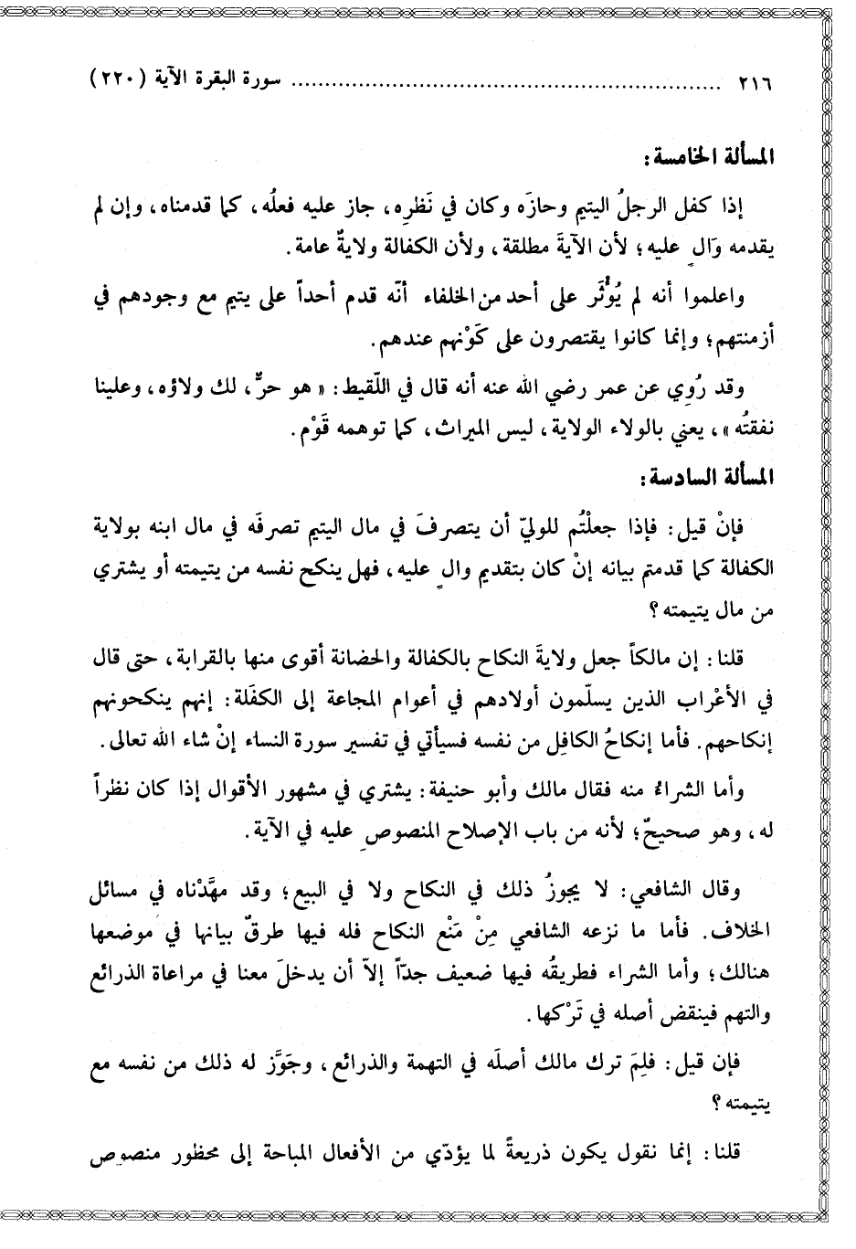 فَأَمَّا إنْكَاحُ الْكَافِلِ مِنْ نَفْسِهِ فَسَيَأْتِي فِي تَفْسِيرِ سُورَةِ النِّسَاءِ إنْ شَاءَ اللَّهُ تَعَالَى. وَأَمَّا الشِّرَاءُ مِنْهُ فَقَالَ مَالِكٌ وَأَبُو حَنِيفَةَ: يَشْتَرِي فِي مَشْهُورِ الْأَقْوَالِ إذَا كَانَ نَظَرًا لَهُ، وَهُوَ صَحِيحٌ؛ لِأَنَّهُ مِنْ بَابِ الْإِصْلَاحِ الْمَنْصُوصِ عَلَيْهِ فِي الْآيَةِ. وَقَالَ الشَّافِعِيُّ: لَا يَجُوزُ ذَلِكَ فِي النِّكَاحِ وَلَا فِي الْبَيْعِ؛ وَقَدْ مَهَّدْنَاهُ فِي مَسَائِلِ الْخِلَافِ. فَأَمَّا مَا نَزَعَهُ الشَّافِعِيُّ مِنْ مَنْعِ النِّكَاحِ فَلَهُ فِيهَا طُرُقٌ بَيَانُهَا فِي مَوْضِعِهَا هُنَالِكَ؛ وَأَمَّا الشِّرَاءُ فَطَرِيقُهُ فِيهَا ضَعِيفٌ جِدًّا إلَّا أَنْ يَدْخُلَ مَعَنَا فِي مُرَاعَاةِ الذَّرَائِعِ وَالتُّهَمِ فَيَنْقُضُ أَصْلَهُ فِي تَرْكِهَا.