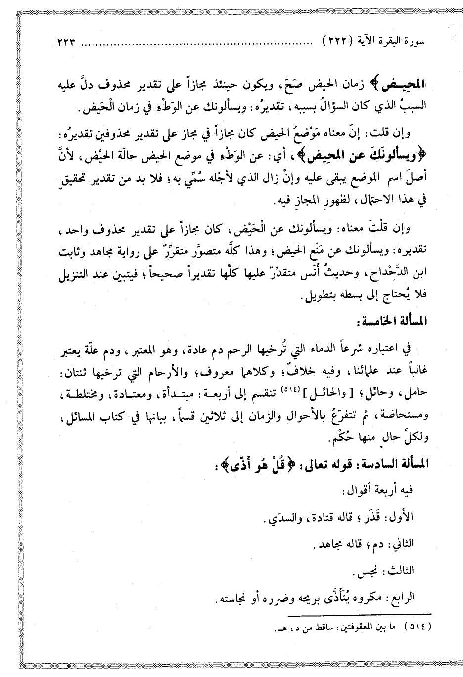 وَإِنْ قُلْت مَعْنَاهُ: وَيَسْأَلُونَك عَنْ الْحَيْضِ، كَانَ مَجَازًا عَلَى تَقْدِيرِ مَحْذُوفٍ وَاحِدٍ، تَقْدِيرُهُ: وَيَسْأَلُونَك عَنْ مَنْعِ الْحَيْضِ؛ وَهَذَا كُلُّهُ مُتَصَوَّرٌ مُتَقَرِّرٌ عَلَى رِوَايَةِ مُجَاهِدٍ وَثَابِتِ بْنِ الدَّحْدَاحَةِ، وَحَدِيثُ أَنَسٍ مُتَقَدِّرٌ عَلَيْهَا كُلِّهَا تَقْدِيرًا صَحِيحًا؛ فَيَتَبَيَّنُ عِنْدَ التَّنْزِيلِ فَلَا يَحْتَاجُ إلَى بَسْطِهِ بِتَطْوِيلٍ.