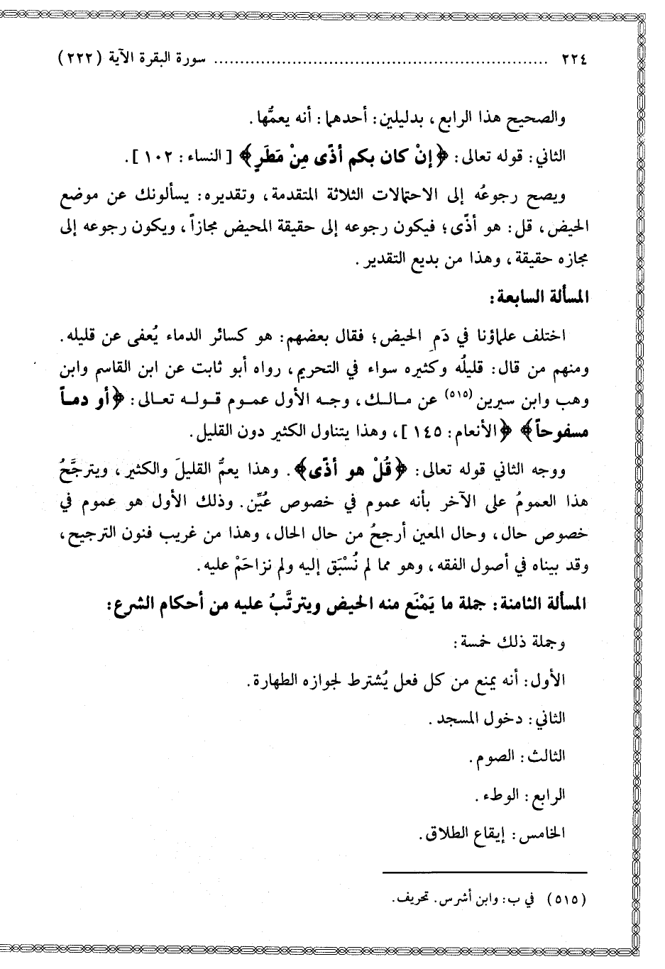 الْمَسْأَلَةُ الثَّامِنَةُ: جُمْلَةُ مَا يَمْنَعُ مِنْهُ الْحَيْضُ وَيَتَرَتَّبُ عَلَيْهِ مِنْ أَحْكَامِ الشَّرْعِ: وَجُمْلَةُ ذَلِكَ خَمْسَةٌ: