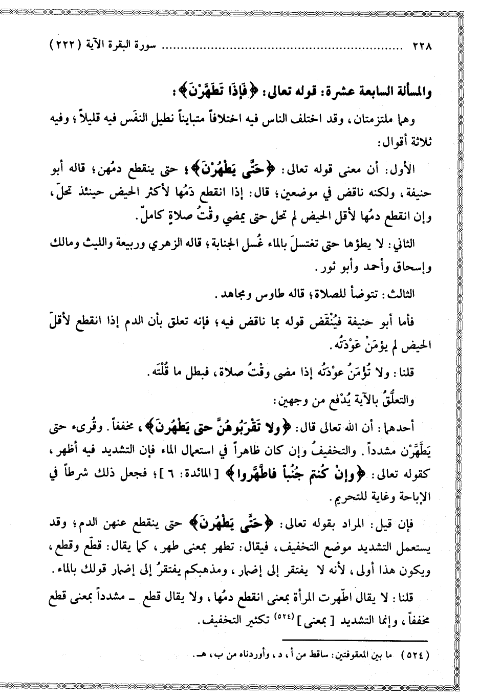 أَحَدُهُمَا: أَنَّ اللَّهَ تَعَالَى قَالَ: {وَلا تَقْرَبُوهُنَّ حَتَّى يَطْهُرْنَ} [البقرة: 222] مُخَفَّفًا. وَقُرِئَ " حَتَّى يَطَّهَّرْنَّ " مُشَدَّدًا. وَالتَّخْفِيفُ وَإِنْ كَانَ ظَاهِرًا فِي اسْتِعْمَالِ الْمَاءِ فَإِنَّ التَّشْدِيدَ فِيهِ أَظْهَرُ لِقَوْلِهِ تَعَالَى: {وَإِنْ كُنْتُمْ جُنُبًا فَاطَّهَّرُوا} [المائدة: 6]؛ فَجَعَلَ ذَلِكَ شَرْطًا فِي الْإِبَاحَةِ وَغَايَةً لِلتَّحْرِيمِ.