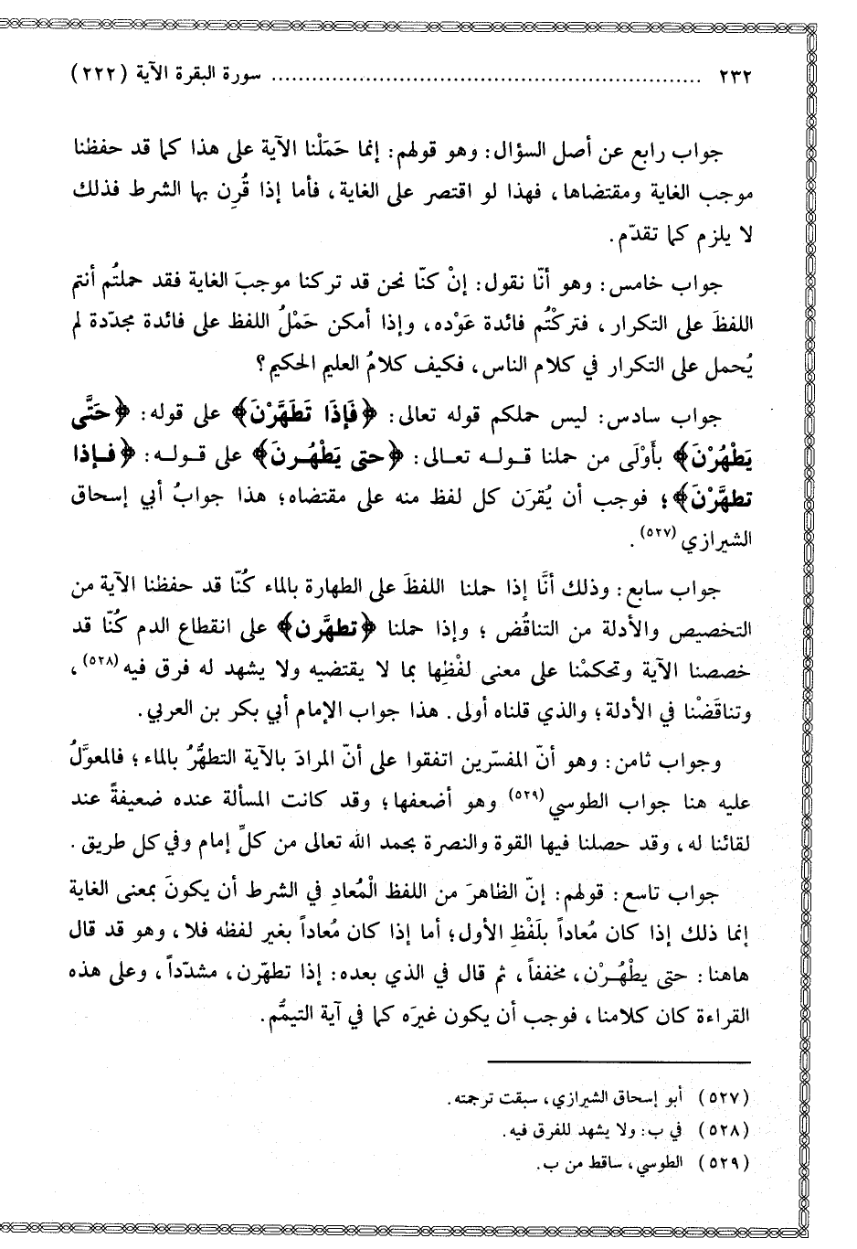 جَوَابٌ سَادِسٌ: لَيْسَ حَمْلُكُمْ قَوْله تَعَالَى: {فَإِذَا تَطَهَّرْنَ} [البقرة: 222] عَلَى قَوْلِهِ: {حَتَّى يَطْهُرْنَ} [البقرة: 222] بِأَوْلَى مِنْ حَمْلِنَا قَوْله تَعَالَى: {حَتَّى يَطْهُرْنَ} [البقرة: 222] عَلَى قَوْلِهِ: {فَإِذَا تَطَهَّرْنَ} [البقرة: 222]؛ فَوَجَبَ أَنْ يُقْرَنَ كُلُّ لَفْظٍ مِنْهُ عَلَى مُقْتَضَاهُ؛ هَذَا جَوَابُ أَبِي إِسْحَاقَ الشِّيرَازِيِّ.