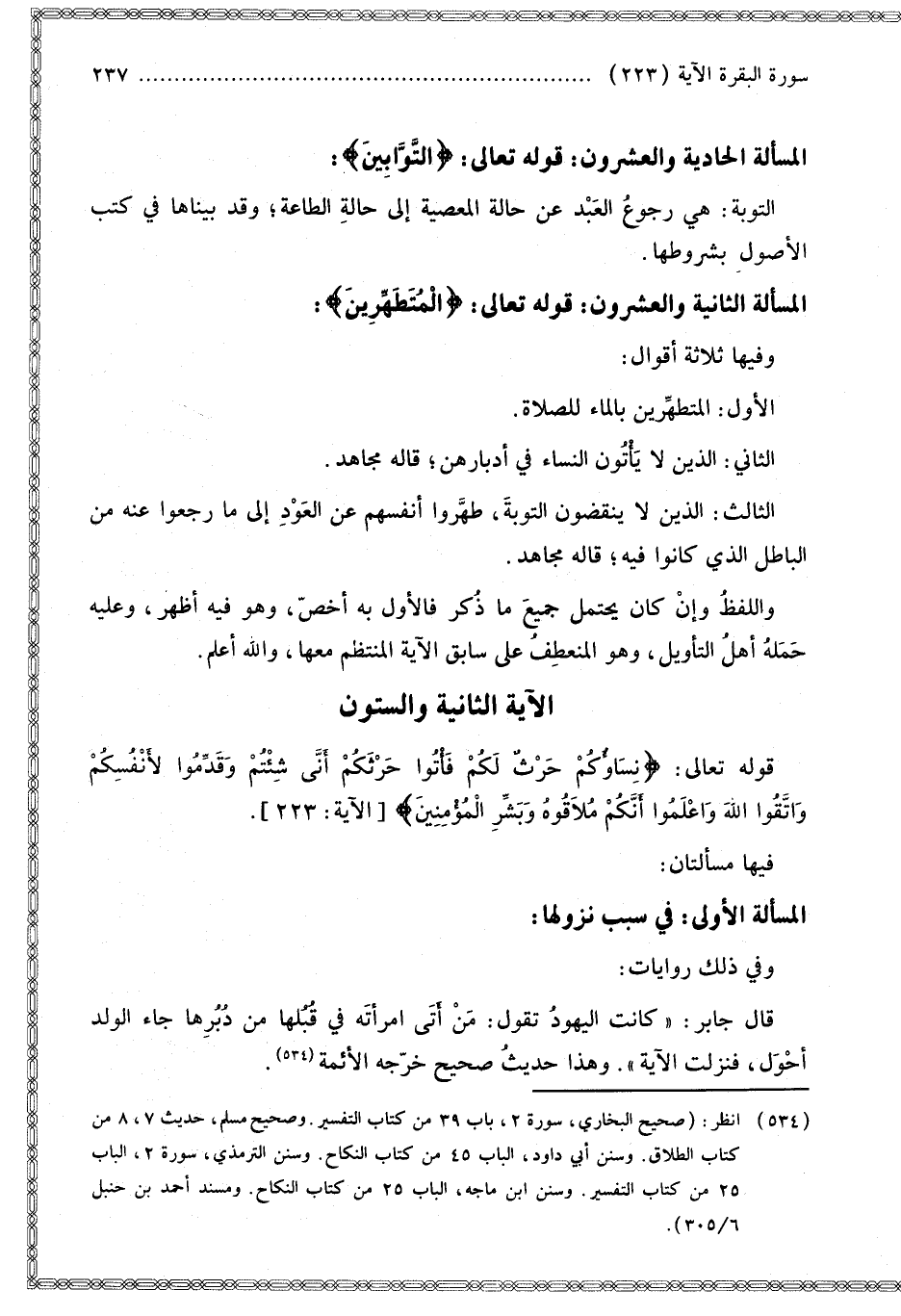 قَوْله تَعَالَى: {نِسَاؤُكُمْ حَرْثٌ لَكُمْ فَأْتُوا حَرْثَكُمْ أَنَّى شِئْتُمْ وَقَدِّمُوا لأَنْفُسِكُمْ وَاتَّقُوا اللَّهَ وَاعْلَمُوا أَنَّكُمْ مُلاقُوهُ وَبَشِّرِ الْمُؤْمِنِينَ} [البقرة: 223] فِيهَا مَسْأَلَتَانِ: