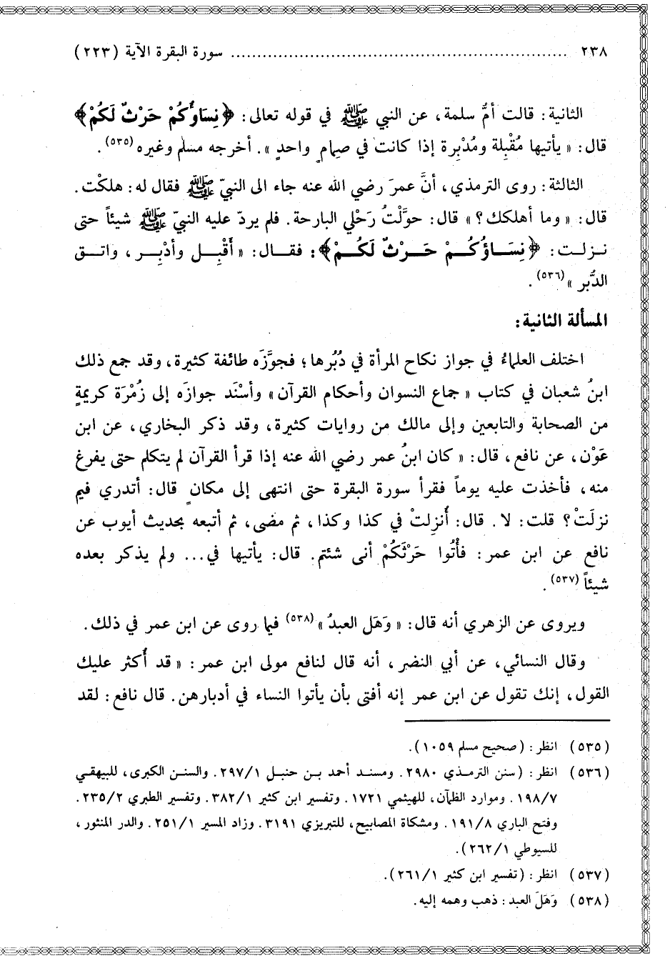 الثَّالِثَةُ: رَوَى التِّرْمِذِيُّ، «أَنَّ عُمَرَ - رَضِيَ اللَّهُ عَنْهُ - جَاءَ إلَى النَّبِيِّ - صَلَّى اللَّهُ عَلَيْهِ وَسَلَّمَ - فَقَالَ لَهُ: هَلَكْت. قَالَ: وَمَا أَهْلَكَك؟ قَالَ: حَوَّلْت رَحْلِي الْبَارِحَةَ. فَلَمْ يَرُدَّ عَلَيْهِ النَّبِيُّ - صَلَّى اللَّهُ عَلَيْهِ وَسَلَّمَ - شَيْئًا حَتَّى نَزَلَتْ: {نِسَاؤُكُمْ حَرْثٌ لَكُمْ} [البقرة: 223]: فَقَالَ: أَقْبِلْ وَأَدْبِرْ، وَاتَّقِ الدُّبُرَ».