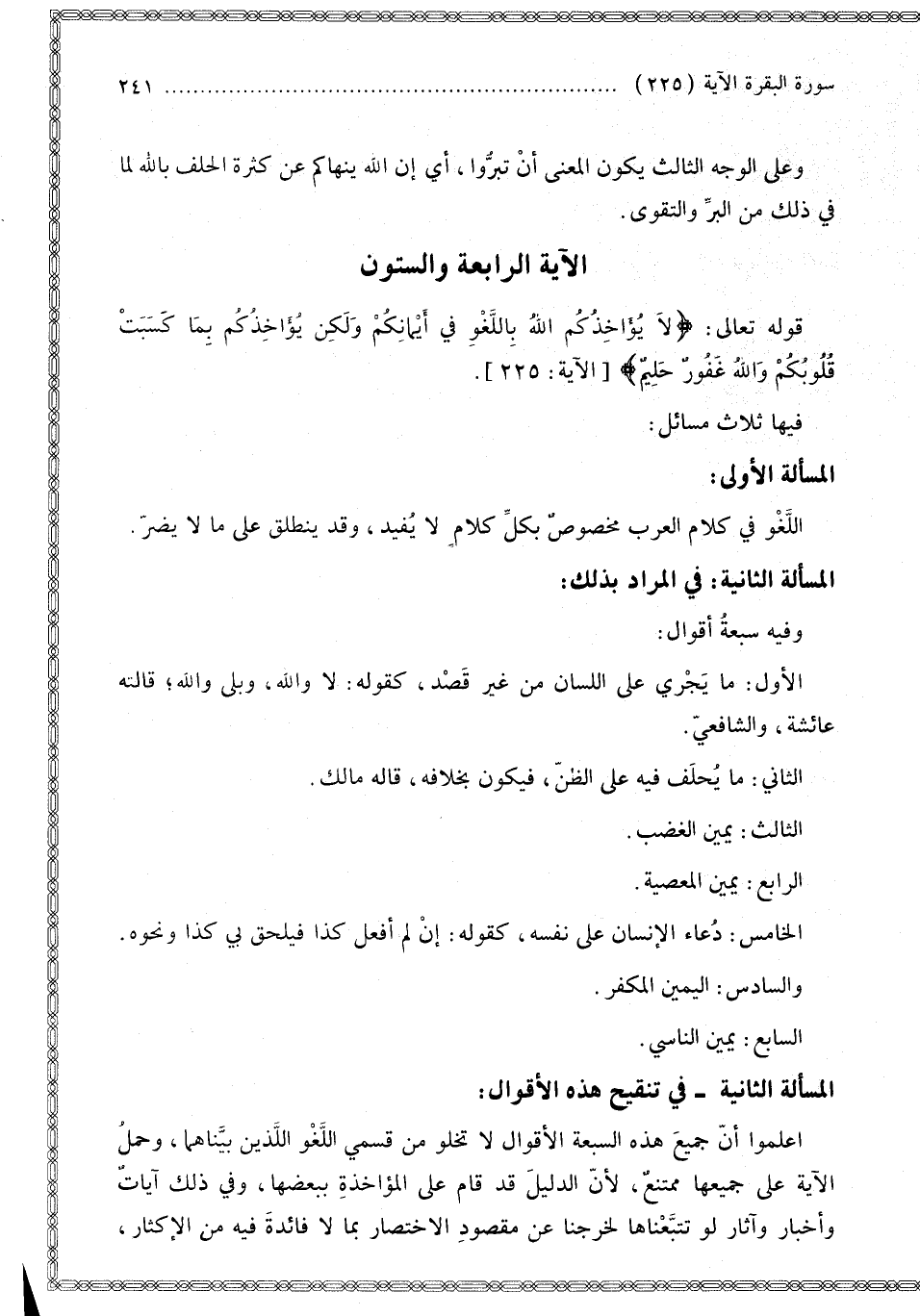 الْمَسْأَلَةُ الثَّانِيَةُ فِي تَنْقِيحِ هَذِهِ الْأَقْوَالِ: اعْلَمُوا أَنَّ جَمِيعَ هَذِهِ السَّبْعَةِ الْأَقْوَالِ لَا تَخْلُو مِنْ قِسْمَيْ اللَّغْوِ اللَّذَيْنِ بَيَّنَّاهُمَا، وَحَمْلُ الْآيَةِ عَلَى جَمِيعِهَا مُمْتَنِعٌ، لِأَنَّ الدَّلِيلَ قَدْ قَامَ عَلَى الْمُؤَاخَذَةِ بِبَعْضِهَا، وَفِي ذَلِكَ آيَاتٌ وَأَخْبَارٌ وَآثَارٌ لَوْ تَتَبَّعْنَاهَا لَخَرَجْنَا عَنْ مَقْصُودِ الِاخْتِصَارِ بِمَا لَا فَائِدَةَ فِيهِ مِنْ الْإِكْثَارِ