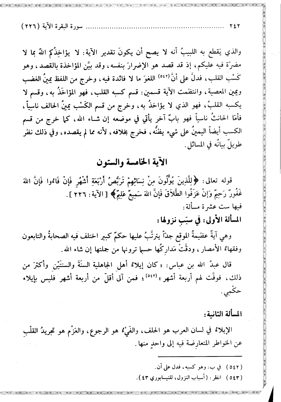 قَوْله تَعَالَى: {لِلَّذِينَ يُؤْلُونَ مِنْ نِسَائِهِمْ تَرَبُّصُ أَرْبَعَةِ أَشْهُرٍ فَإِنْ فَاءُوا فَإِنَّ اللَّهَ غَفُورٌ رَحِيمٌ} [البقرة: 226] {وَإِنْ عَزَمُوا الطَّلاقَ فَإِنَّ اللَّهَ سَمِيعٌ عَلِيمٌ} [البقرة: 227] فِيهَا سِتَّ عَشْرَةَ مَسْأَلَةً: