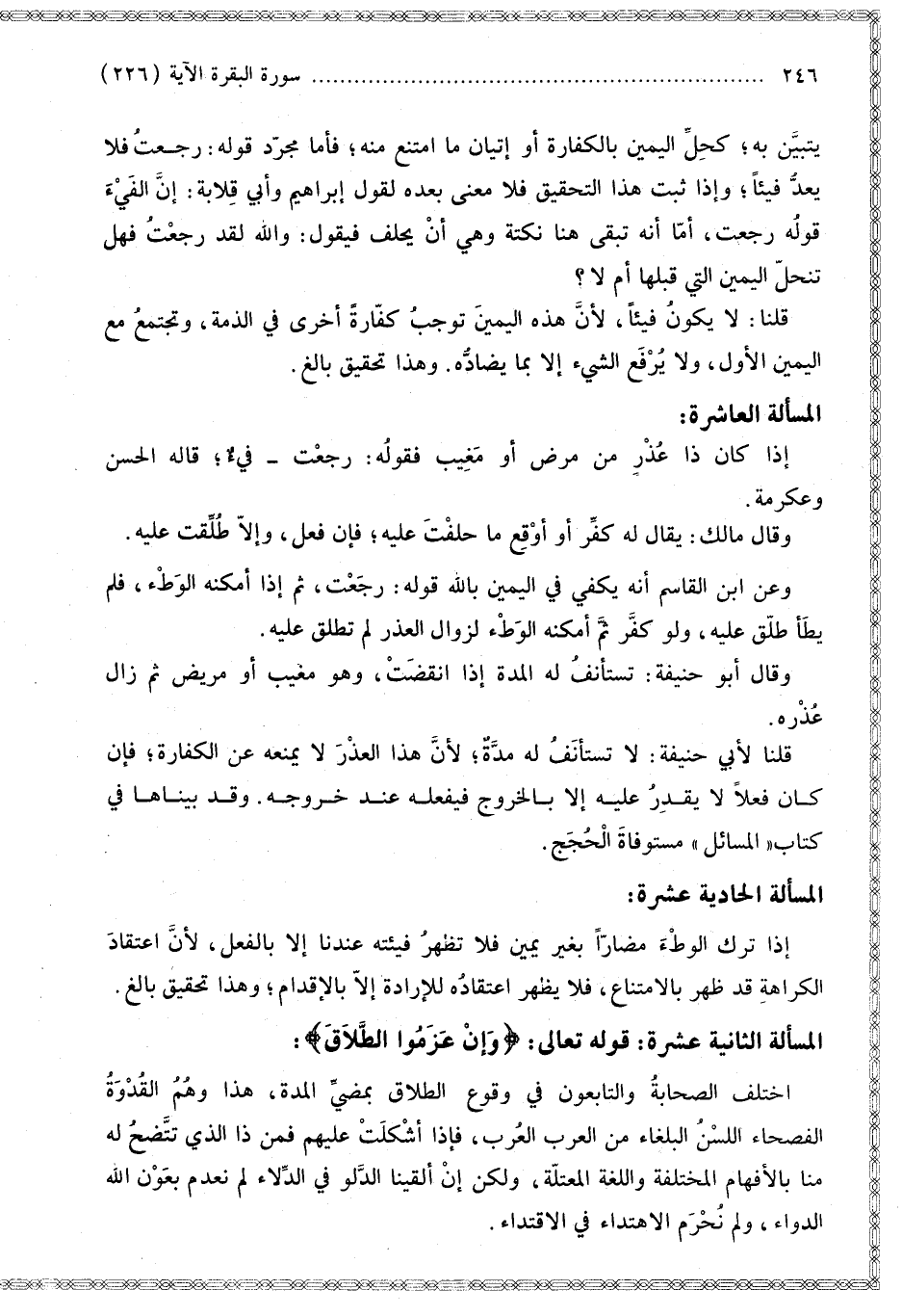 الْمَسْأَلَةُ الثَّانِيَةَ عَشْرَةَ: قَوْله تَعَالَى: {وَإِنْ عَزَمُوا الطَّلاقَ} [البقرة: 227]: اخْتَلَفَ الصَّحَابَةُ وَالتَّابِعُونَ فِي وُقُوعِ الطَّلَاقِ بِمُضِيِّ الْمُدَّةِ، هَذَا وَهُمْ الْقُدْوَةُ الْفُصَحَاءُ اللُّسْنُ الْبُلَغَاءُ مِنْ الْعَرَبِ الْعُرْبِ، فَإِذَا أَشْكَلَتْ عَلَيْهِمْ فَمَنْ ذَا الَّذِي تَتَّضِحُ لَهُ مِنَّا بِالْأَفْهَامِ الْمُخْتَلِفَةِ وَاللُّغَةِ الْمُعْتَلَّةِ، وَلَكِنْ إنْ أَلْقَيْنَا الدَّلْوَ فِي الدِّلَاءِ لَمْ نَعْدَمْ بِعَوْنِ اللَّهِ الدَّوَاءَ، وَلَمْ نُحْرَمْ الِاهْتِدَاءَ فِي الِاقْتِدَاءِ.