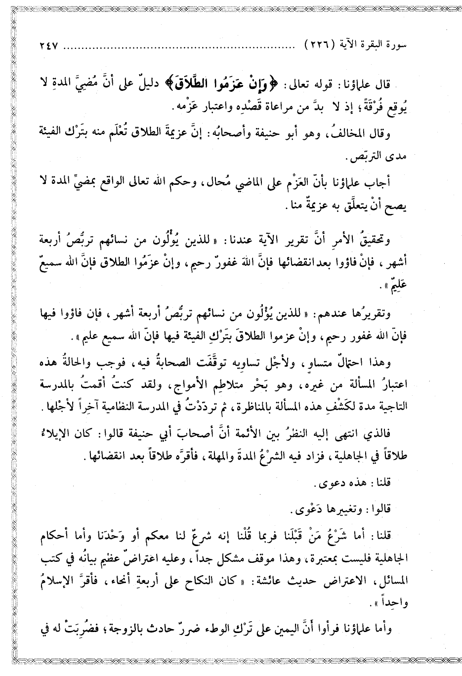 وَتَحْقِيقُ الْأَمْرُ أَنَّ تَقْرِيرَ الْآيَةَ عِنْدَنَا: " لِلَّذِينَ يُؤْلُونَ مِنْ نِسَائِهِمْ تَرَبُّصُ أَرْبَعَةِ أَشْهُرٍ، فَإِنْ فَاءُوا بَعْدَ انْقِضَائِهَا فَإِنَّ اللَّهَ غَفُورٌ رَحِيمٌ، وَإِنْ عَزَمُوا الطَّلَاقَ فَإِنَّ اللَّهَ سَمِيعٌ عَلِيمٌ ".