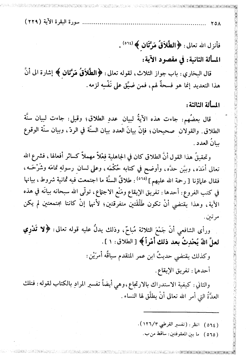 فَأَنْزَلَ اللَّهُ تَعَالَى: {الطَّلاقُ مَرَّتَانِ} [البقرة: 229]» الْمَسْأَلَةُ الثَّانِيَةُ: فِي مَقْصُودِ الْآيَةِ: قَالَ الْبُخَارِيُّ: بَابُ جَوَازِ الثَّلَاثِ لِقَوْلِهِ تَعَالَى: {الطَّلاقُ مَرَّتَانِ} [البقرة: 229] إشَارَةٌ إلَى أَنَّ هَذَا التَّعْدِيدَ إنَّمَا هُوَ فُسْحَةٌ لَهُمْ، فَمَنْ ضَيَّقَ عَلَى نَفْسِهِ لَزِمَهُ.