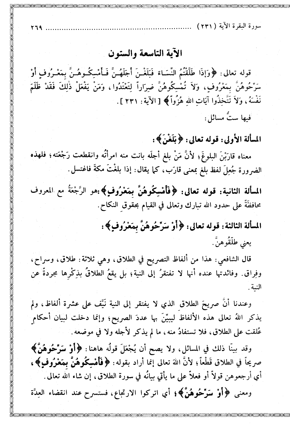 قَوْله تَعَالَى: {وَإِذَا طَلَّقْتُمُ النِّسَاءَ فَبَلَغْنَ أَجَلَهُنَّ فَأَمْسِكُوهُنَّ بِمَعْرُوفٍ أَوْ سَرِّحُوهُنَّ بِمَعْرُوفٍ وَلا تُمْسِكُوهُنَّ ضِرَارًا لِتَعْتَدُوا وَمَنْ يَفْعَلْ ذَلِكَ فَقَدْ ظَلَمَ نَفْسَهُ وَلا تَتَّخِذُوا آيَاتِ اللَّهِ هُزُوًا} [البقرة: 231]