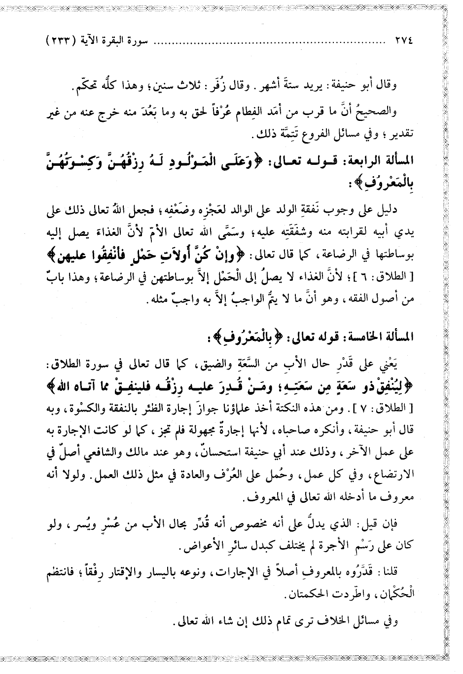 الْمَسْأَلَةُ الرَّابِعَةُ: قَوْله تَعَالَى: {وَعَلَى الْمَوْلُودِ لَهُ رِزْقُهُنَّ وَكِسْوَتُهُنَّ بِالْمَعْرُوفِ} [البقرة: 233] دَلِيلٌ عَلَى وُجُوبِ نَفَقَةِ الْوَلَدِ عَلَى الْوَالِدِ لِعَجْزِهِ وَضَعْفِهِ؛ فَجَعَلَ اللَّهُ تَعَالَى ذَلِكَ عَلَى يَدَيْ أَبِيهِ لِقَرَابَتِهِ مِنْهُ وَشَفَقَتِهِ عَلَيْهِ؛ وَسَمَّى اللَّهُ تَعَالَى الْأُمَّ لِأَنَّ الْغِذَاءَ يَصِلُ إلَيْهِ بِوَسَاطَتِهَا فِي الرَّضَاعَةِ، كَمَا قَالَ تَعَالَى: {وَإِنْ كُنَّ أُولاتِ حَمْلٍ فَأَنْفِقُوا عَلَيْهِنَّ} [الطلاق: 6] لِأَنَّ الْغِذَاءَ لَا يَصِلُ إلَى الْحَمْلِ إلَّا بِوَسَاطَتِهِنَّ فِي الرَّضَاعَةِ؛ وَهَذَا بَابٌ مِنْ أُصُولِ الْفِقْهِ، وَهُوَ أَنَّ مَا لَا يَتِمُّ الْوَاجِبُ إلَّا بِهِ وَاجِبٌ مِثْلُهُ.