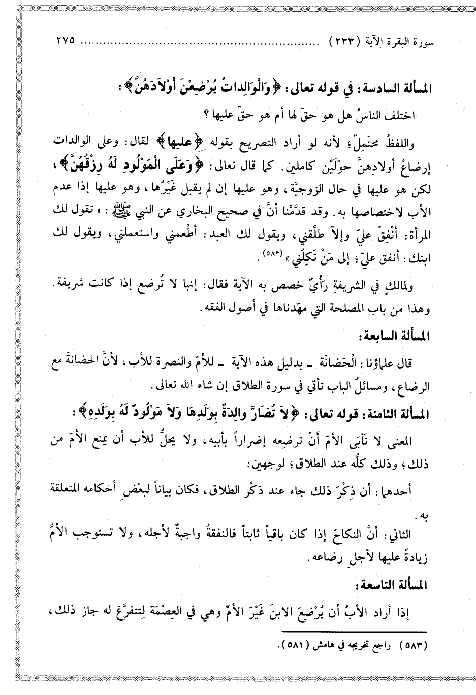 الْمَسْأَلَةُ السَّابِعَةُ: قَالَ عُلَمَاؤُنَا: الْحَضَانَةُ بِدَلِيلِ هَذِهِ الْآيَةِ لِلْأُمِّ وَالنُّصْرَةُ لِلْأَبِ، لِأَنَّ الْحَضَانَةَ مَعَ الرَّضَاعِ، وَمَسَائِلُ الْبَابِ تَأْتِي فِي سُورَةِ الطَّلَاقِ إنْ شَاءَ اللَّهُ تَعَالَى.