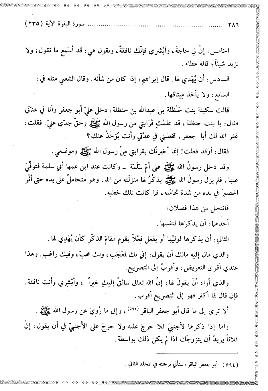قَالَتْ سُكَيْنَةُ بِنْتُ حَنْظَلَةَ بْنِ عَبْدِ اللَّهِ بْنِ حَنْظَلَةَ: دَخَلَ عَلَيَّ أَبُو جَعْفَرٍ وَأَنَا فِي عِدَّتِي فَقَالَ: يَا بِنْتَ حَنْظَلَةَ، قَدْ عَلِمْت قَرَابَتِي مِنْ رَسُولِ اللَّهِ - صَلَّى اللَّهُ عَلَيْهِ وَسَلَّمَ - وَحَقَّ جَدِّي عَلِيٍّ. فَقُلْت: غَفَرَ اللَّهُ لَك أَبَا جَعْفَرٍ، تَخْطُبنِي فِي عِدَّتِي وَأَنْتَ يُؤْخَذُ عَنْك؟ فَقَالَ: أَوَقَدْ فَعَلْت، إنَّمَا أَخْبَرْتُك بِقَرَابَتِي مِنْ رَسُولِ اللَّهِ - صَلَّى اللَّهُ عَلَيْهِ وَسَلَّمَ - وَمَوْضِعِي.
