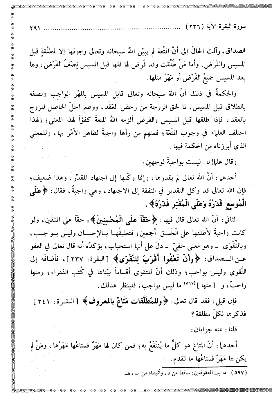 وَالْحِكْمَةُ فِي ذَلِكَ أَنَّ اللَّهَ سُبْحَانَهُ وَتَعَالَى قَابَلَ الْمَسِيسَ بِالْمَهْرِ الْوَاجِبِ وَنِصْفَهُ بِالطَّلَاقِ قَبْلَ الْمَسِيسِ، لِمَا لَحِقَ الزَّوْجَةَ مِنْ رَحْضِ الْعَقْدِ، وَوَصْمِ الْحِلِّ الْحَاصِلِ لِلزَّوْجِ بِالْعَقْدِ، فَإِذَا طَلَّقَهَا قَبْلَ الْمَسِيسِ وَالْفَرْضِ أَلْزَمَهُ اللَّهُ الْمُتْعَةَ كُفُؤًا لِهَذَا الْمَعْنَى؛ وَلِهَذَا اخْتَلَفَ الْعُلَمَاءُ فِي وُجُوبِ الْمُتْعَةِ، فَمِنْهُمْ مَنْ رَآهَا وَاجِبَةً لِظَاهِرِ الْأَمْرِ بِهَا، وَلِلْمَعْنَى الَّذِي أَبْرَزْنَاهُ مِنْ الْحِكْمَةِ فِيهَا.