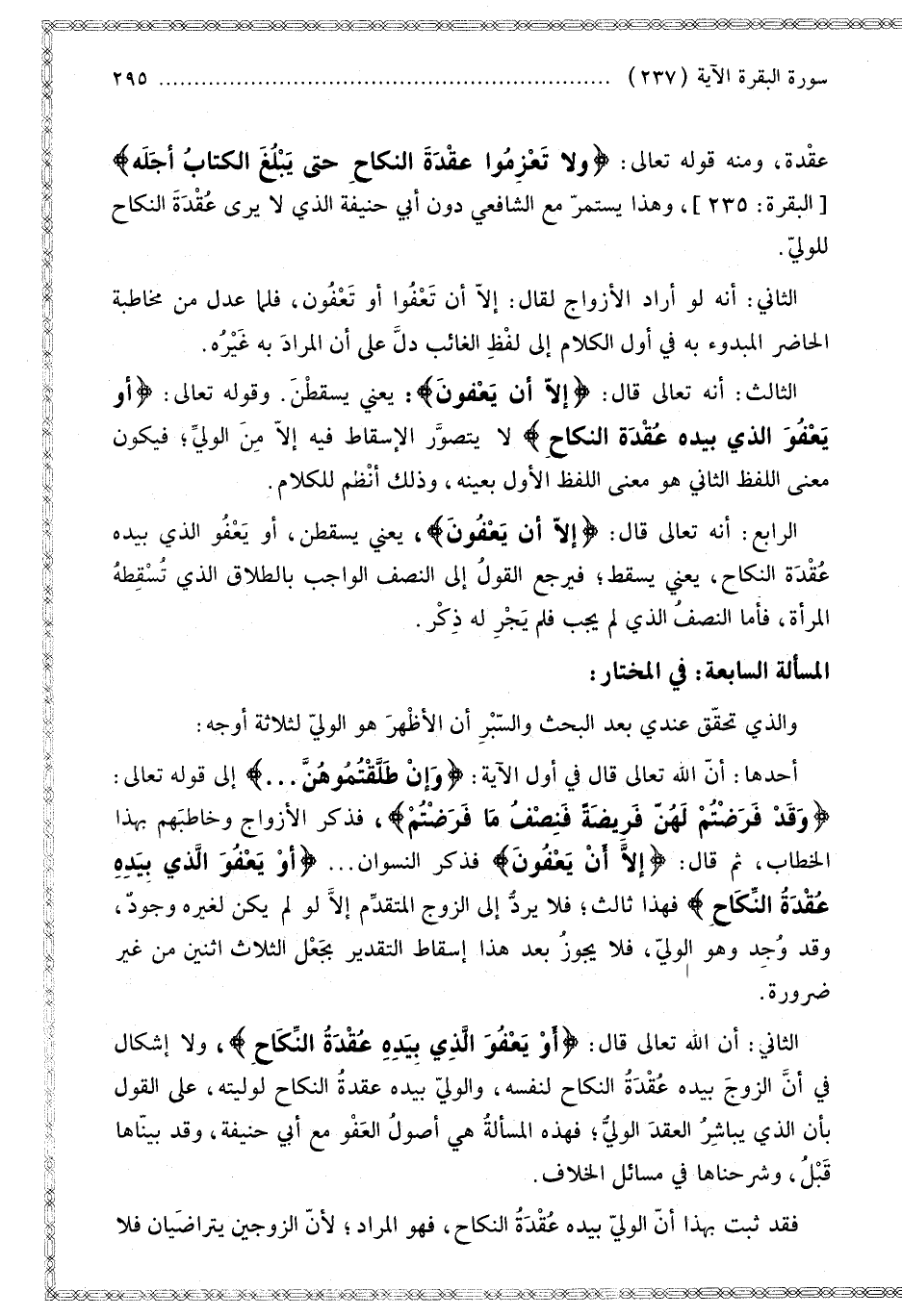 الْمَسْأَلَةُ السَّابِعَةُ: فِي الْمُخْتَارِ: وَاَلَّذِي تَحَقَّقَ عِنْدِي بَعْدَ الْبَحْثِ وَالسَّبْرِ أَنَّ الْأَظْهَرَ هُوَ الْوَلِيُّ لِثَلَاثَةِ أَوْجُهٍ: أَحَدُهَا: أَنَّ اللَّهَ تَعَالَى قَالَ فِي أَوَّلِ الْآيَةِ: {ثُمَّ طَلَّقْتُمُوهُنَّ} [الأحزاب: 49] إلَى قَوْله تَعَالَى: {وَقَدْ فَرَضْتُمْ لَهُنَّ فَرِيضَةً فَنِصْفُ مَا فَرَضْتُمْ} [البقرة: 237] فَذَكَرَ الْأَزْوَاجَ وَخَاطَبَهُمْ بِهَذَا الْخِطَابِ، ثُمَّ قَالَ: {إِلا أَنْ يَعْفُونَ} [البقرة: 237] فَذَكَرَ النِّسْوَانَ {أَوْ يَعْفُوَ الَّذِي بِيَدِهِ عُقْدَةُ النِّكَاحِ} [البقرة: 237] فَهَذَا ثَالِثٌ؛ فَلَا يُرَدُّ إلَى الزَّوْجِ الْمُتَقَدِّمِ إلَّا لَوْ لَمْ يَكُنْ لِغَيْرِهِ وُجُودٌ، وَقَدْ وُجِدَ وَهُوَ الْوَلِيُّ، فَلَا يَجُوزُ بَعْدَ هَذَا إسْقَاطُ التَّقْدِيرِ بِجَعْلِ الثَّلَاثِ اثْنَيْنِ مِنْ غَيْرِ ضَرُورَةٍ.