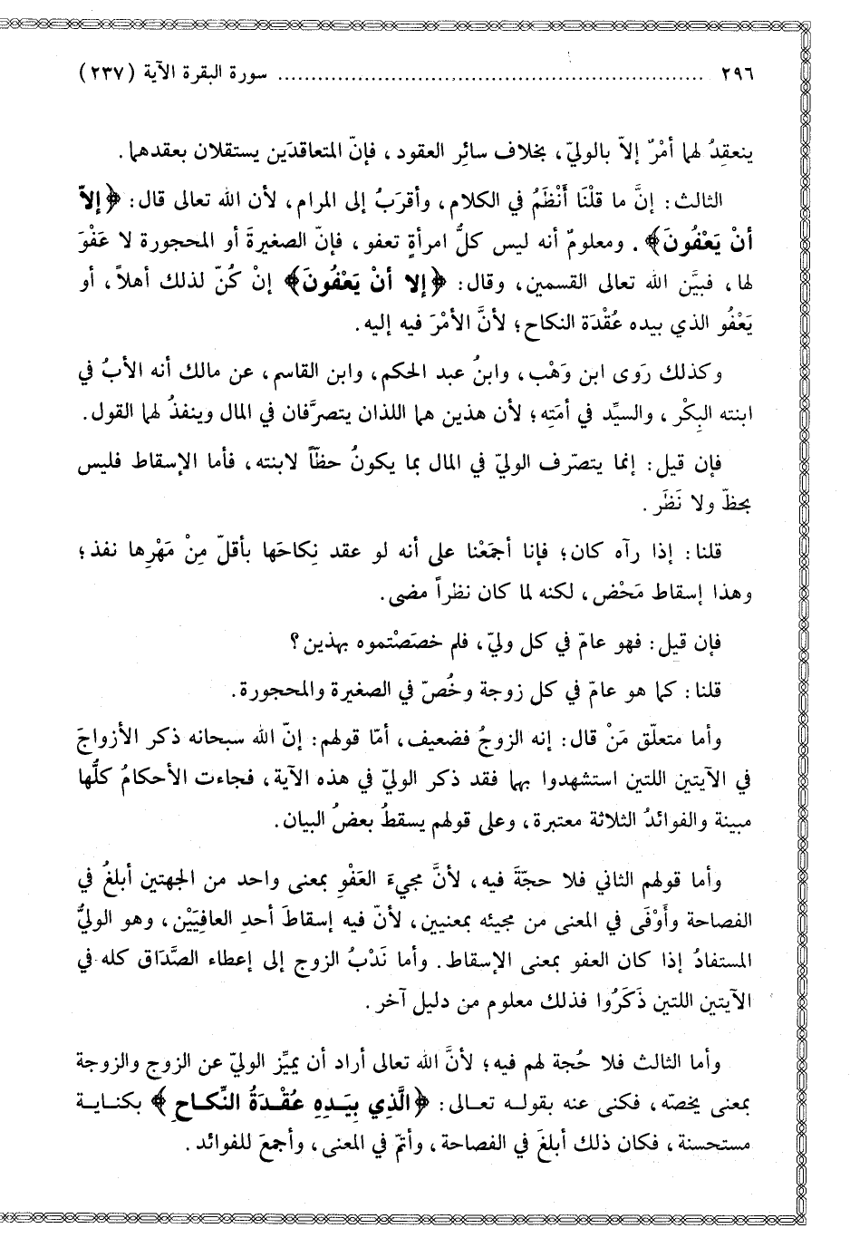 الثَّالِثُ: إنَّ مَا قُلْنَا أَنْظَمُ فِي الْكَلَامِ، وَأَقْرَبُ إلَى الْمَرَامِ؛ لِأَنَّ اللَّهَ تَعَالَى قَالَ: {إِلا أَنْ يَعْفُونَ} [البقرة: 237] وَمَعْلُومٌ أَنَّهُ لَيْسَ كُلُّ امْرَأَةٍ تَعْفُو، فَإِنَّ الصَّغِيرَةَ أَوْ الْمَحْجُورَةَ لَا عَفْوَ لَهَا، فَبَيَّنَ اللَّهُ تَعَالَى الْقِسْمَيْنِ، وَقَالَ: {إِلا أَنْ يَعْفُونَ} [البقرة: 237] إنْ كُنَّ لِذَلِكَ أَهْلًا، أَوْ يَعْفُوَ الَّذِي بِيَدِهِ عُقْدَةُ النِّكَاحِ؛ لِأَنَّ الْأَمْرَ فِيهِ إلَيْهِ.