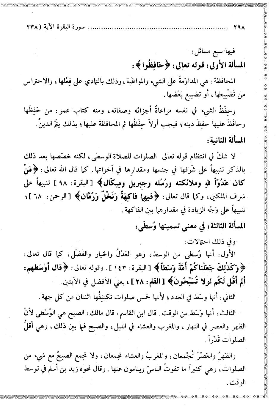 الْمَسْأَلَةُ الثَّانِيَةُ: لَا شَكَّ فِي انْتِظَامِ قَوْله تَعَالَى " الصَّلَوَاتِ " لِلصَّلَاةِ الْوُسْطَى لَكِنَّهُ خَصَّصَهَا بَعْدَ ذَلِكَ بِالذِّكْرِ تَنْبِيهًا عَلَى شَرَفِهَا فِي جِنْسِهَا وَمِقْدَارِهَا فِي أَخَوَاتِهَا.